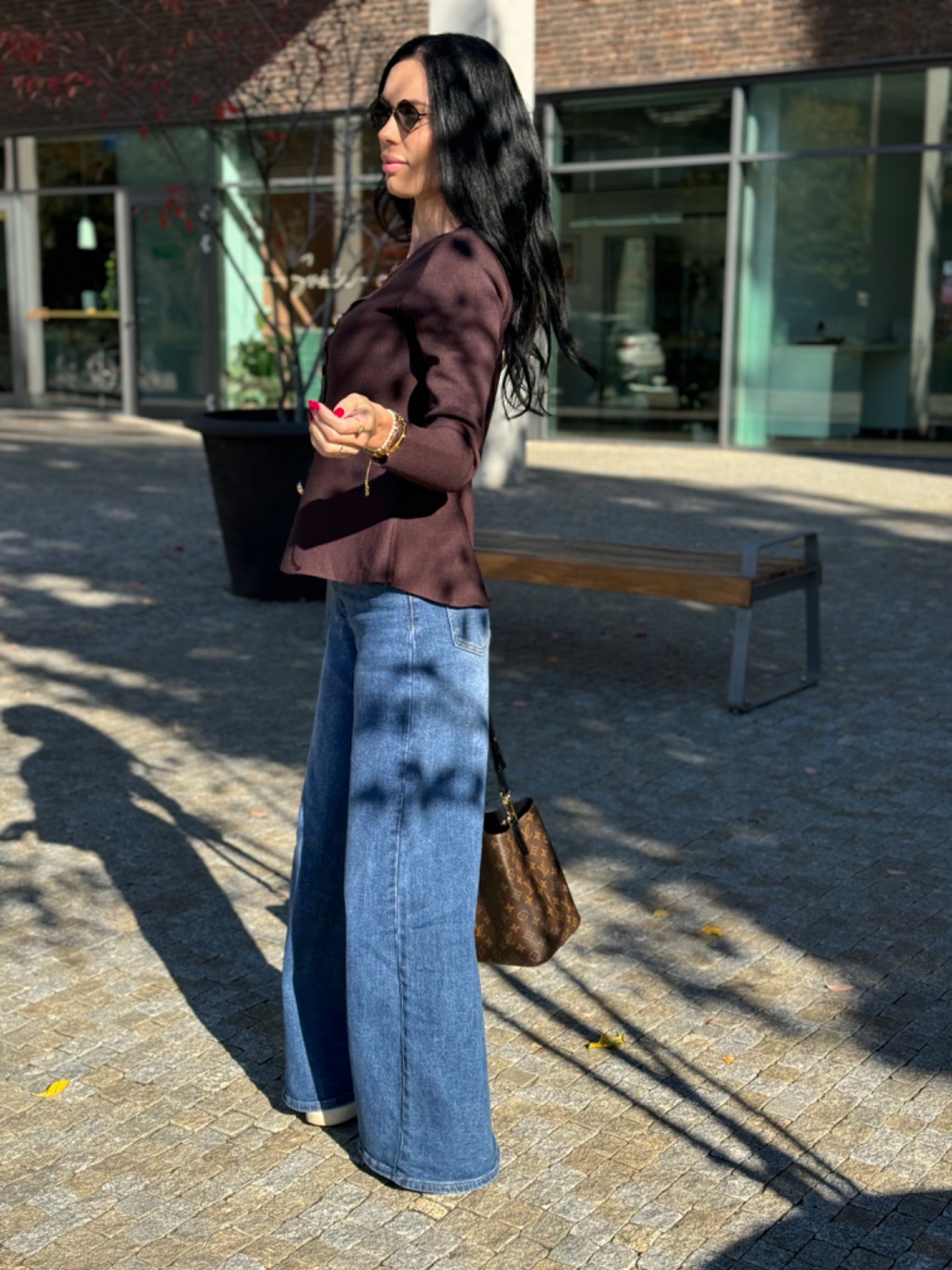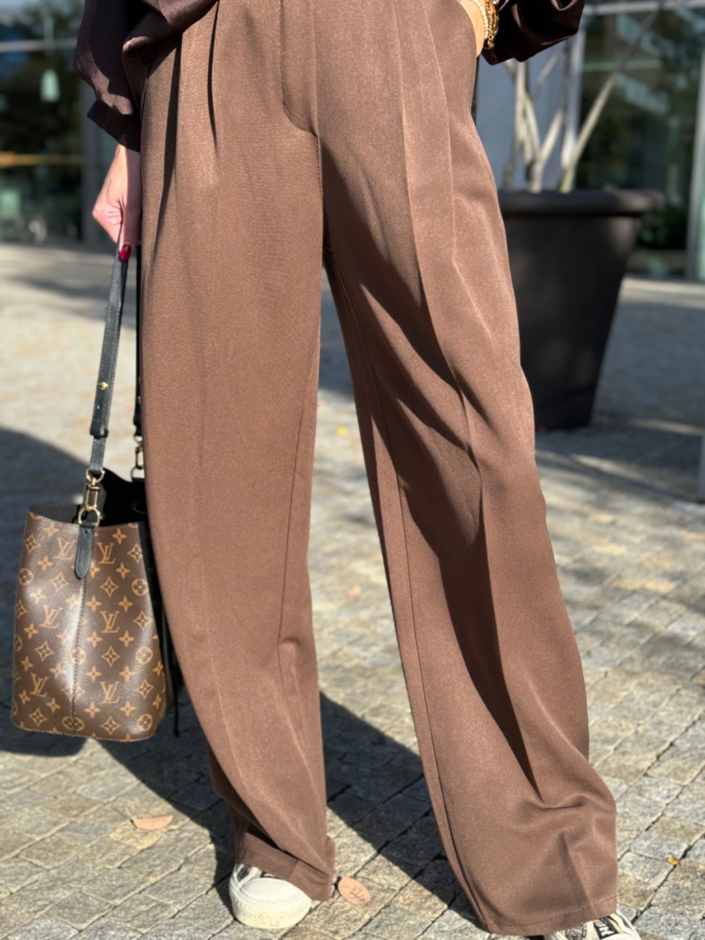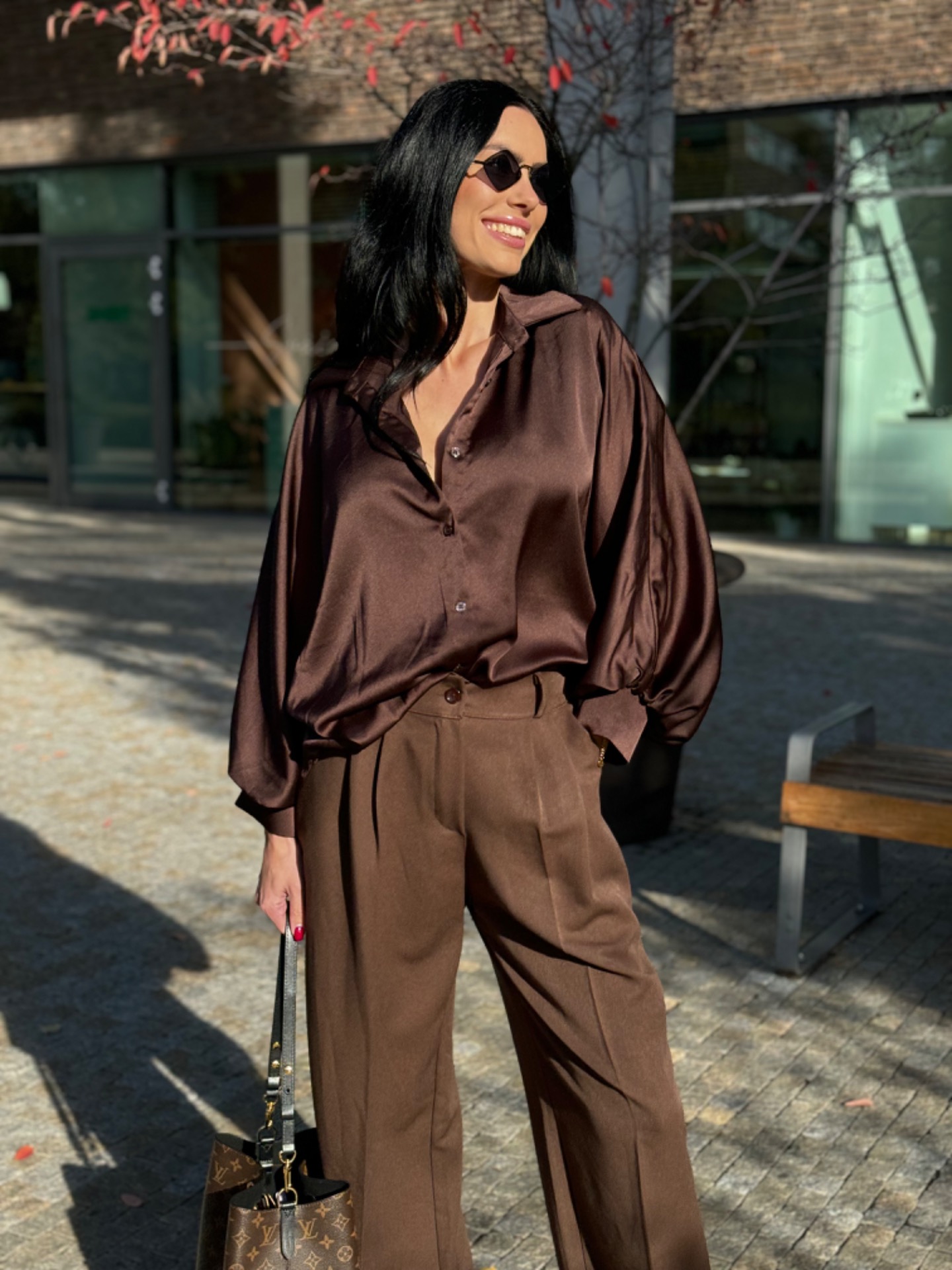 Splývavé kalhoty s moderními, širokými nohavicemi - nyní velký hit. Materiál nemačkavý, teplejší. Po stránách kapsy. Skvěle "padnou" každé postavě. Kalhoty mají v pase gumu a zapínáni na zip a knoflík. Modelka běžně nosí vel. XS na 172 cm vysoké postavě. V nabídce ve více barvách. Barva: Černá, hnědá, Bordó Materiál : 70% polyester 30% Viscoza Velikost : pas: guma 35 cm, délka: 105 cm, sed: 32 cm