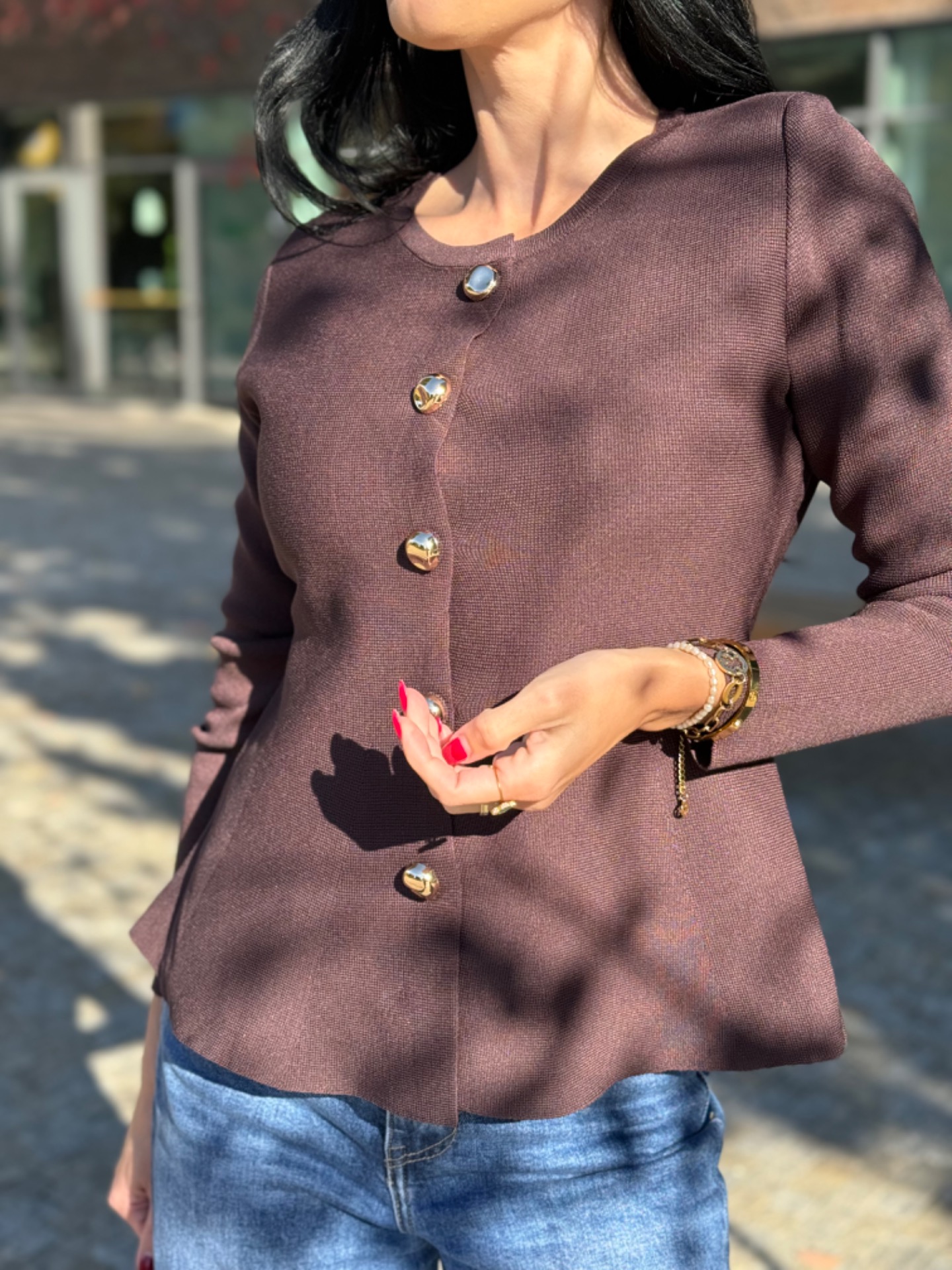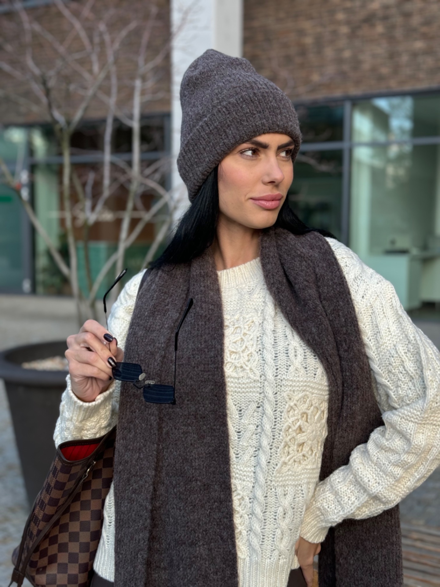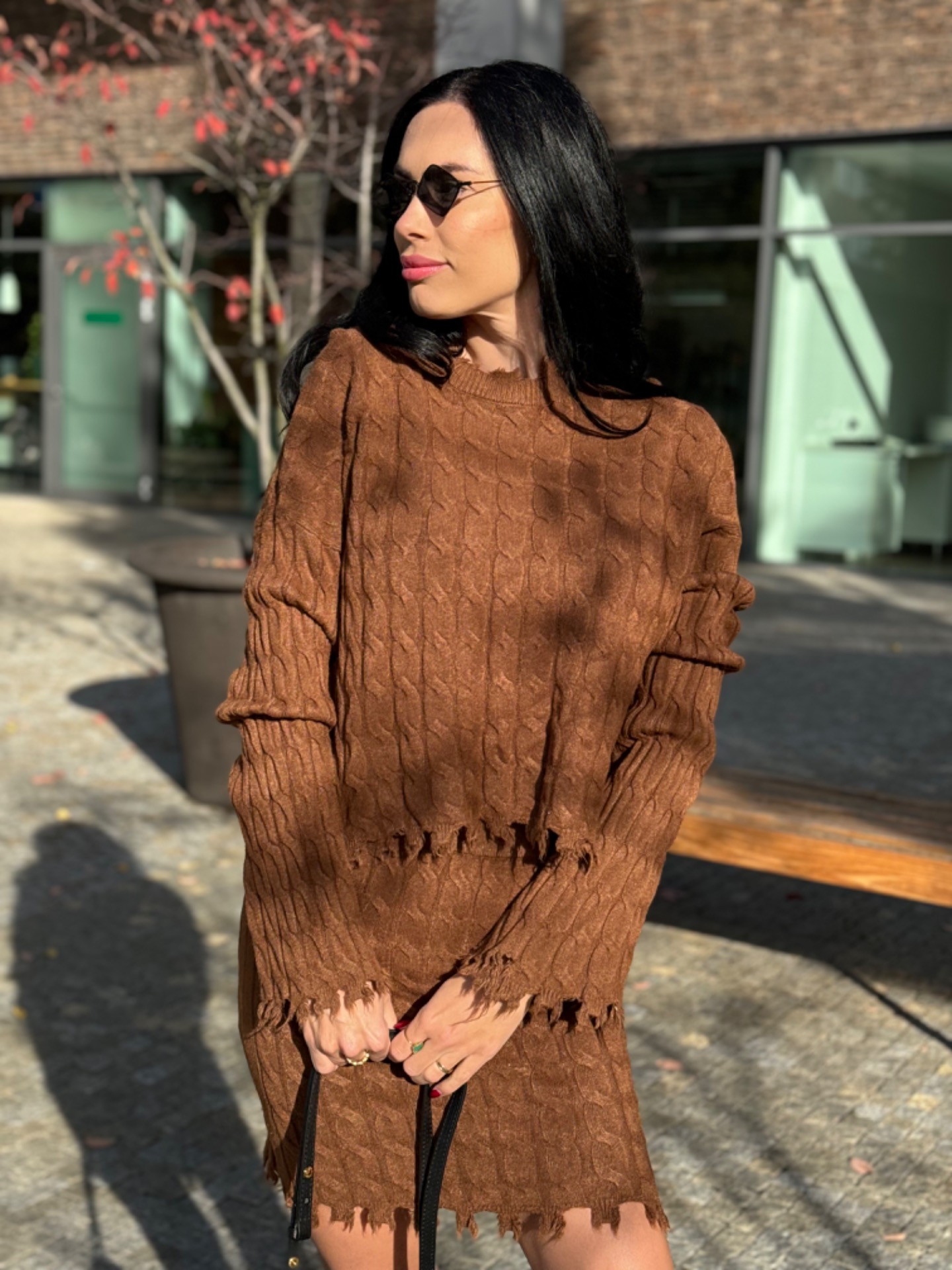 Nádherný komplet z úpletu - velmi kvalitní materiál. Copánkový vzor. Sukně v pase na širokou gumu. Foceno na postavě XS/172 cm. Barva : Hnědá Materiál: 45% modal 30% viscoza 15% angora 10% spandex Velikost: UNI: Svetr: délka: 55 cm šírka: 50 cm délka rukávu: 57 cm Sukně: délka: 50 cm pas: 34 cm ( guma)