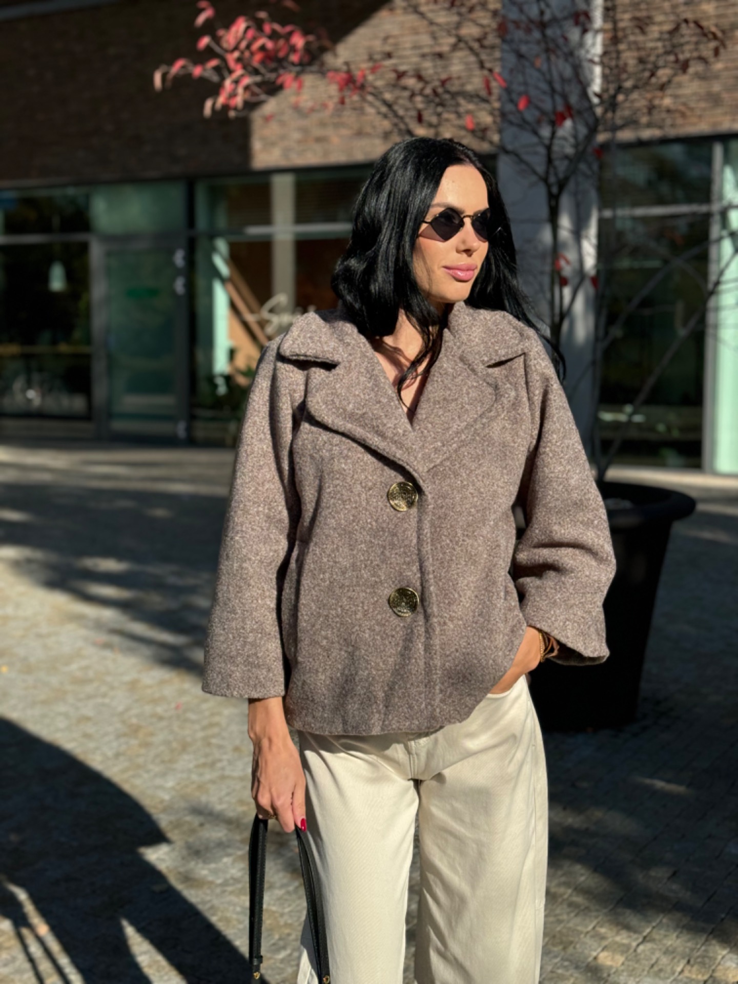Přechodový kabát z koženky. Bundička má límeček a zapínání na knoflíky. V nabídce ve více barvách.Foceno na postavě XS/172 cm. Barva : Béžová, hnědá, bordó, černá Materiál: 100% Poliester Velikost: UNI: šířka: 55 cm délka: 50 cm rukáv: 58 cm