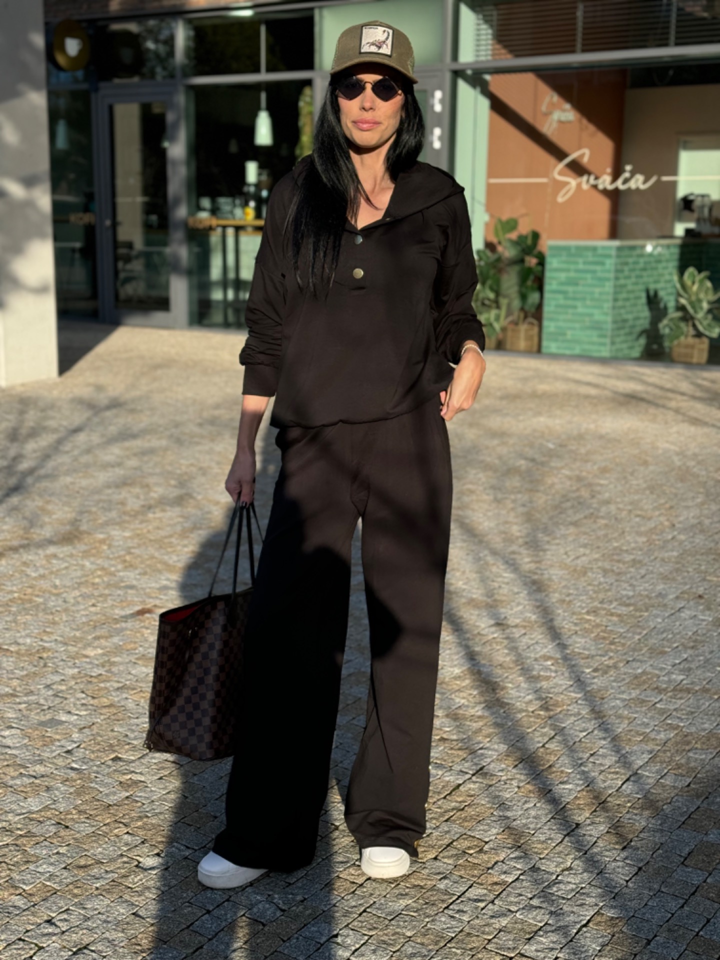 Nádherný, komplet podílem bavlny - velmi kvalitní materiál. Skvělý střih kalhot "sedne" každé postavě. Kalhoty v pase na širokou gumu. Mikina má délku akorád pod zadek. Foceno na postavě XS/172 cm. Komplet "sedne" XS-M. Barva : černà Materiál: 35% Bavlna, 50% Polyester, 5% Elastan Velikost: UNI: TOP: Šířka průramků: 52 cm Délka: 64 cm Délka rukávu od ramene: 60 cm Kalhoty: Pas (nenatažený): 38 cm Boky: 52 cm Délka: 99 cm