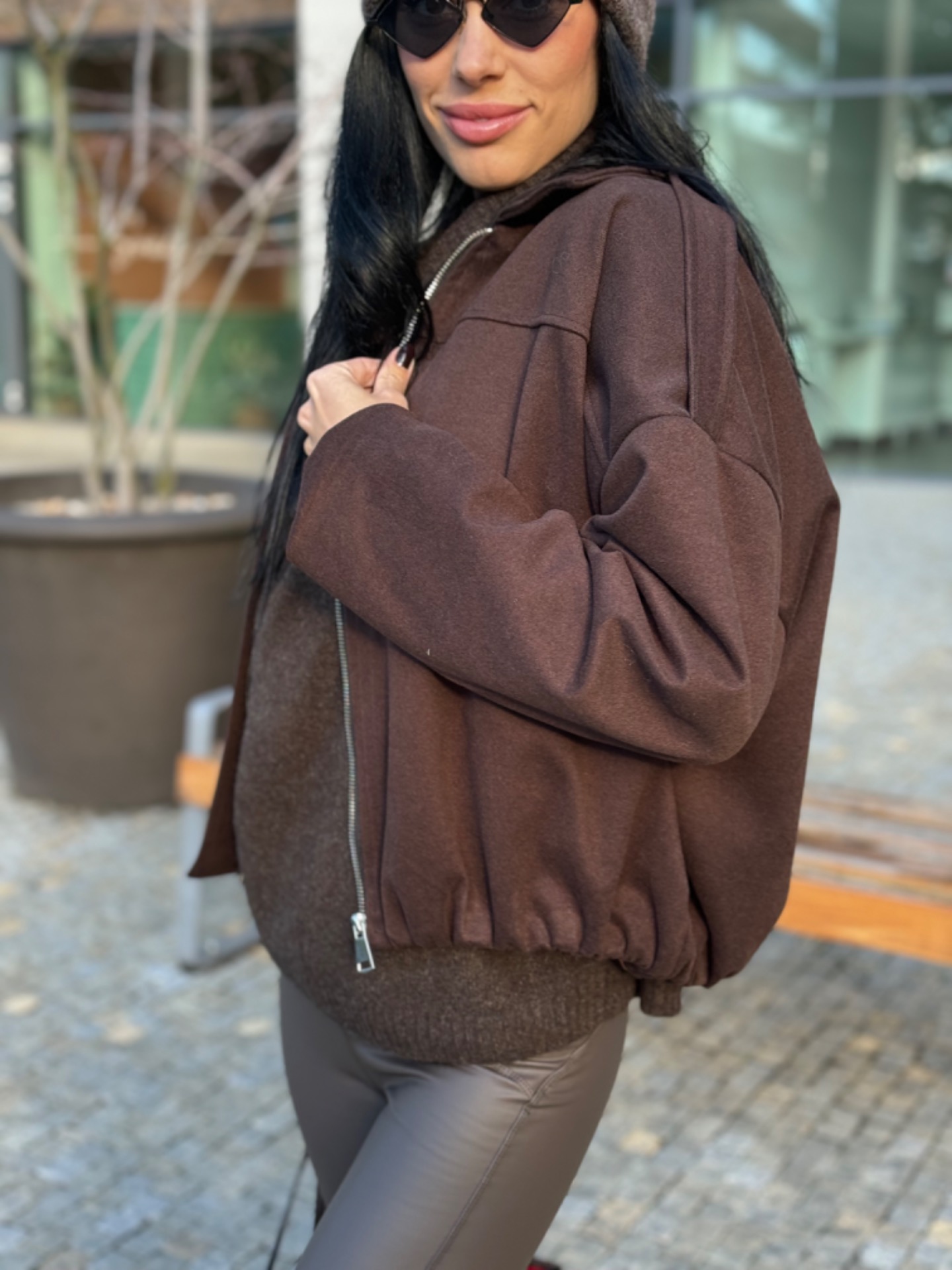 Přechodový bomber z měkkého materiálu. Kabátek má střih bomberu.Foceno na postavě XS/172 cm. S podšívkou a zapínání na zip.V nabídce v několika barvách Barva : bordó, černá, hnědá Materiál: 100% Cotton Velikost: UNI: šířka: 60 cm délka: 60 cm rukáv: 58 cm