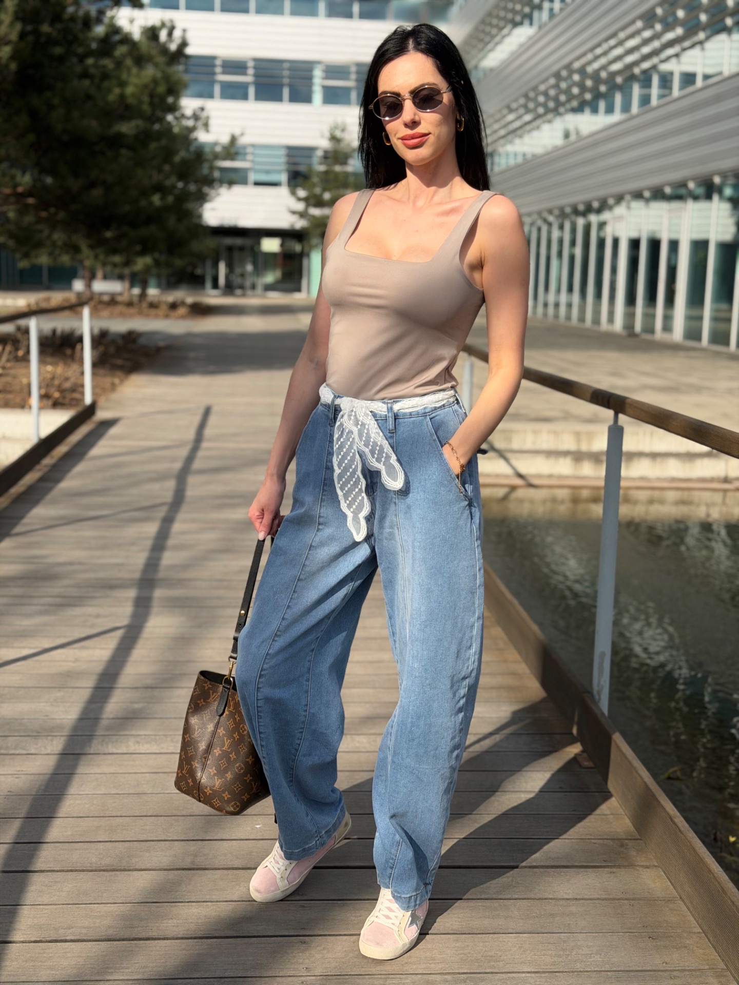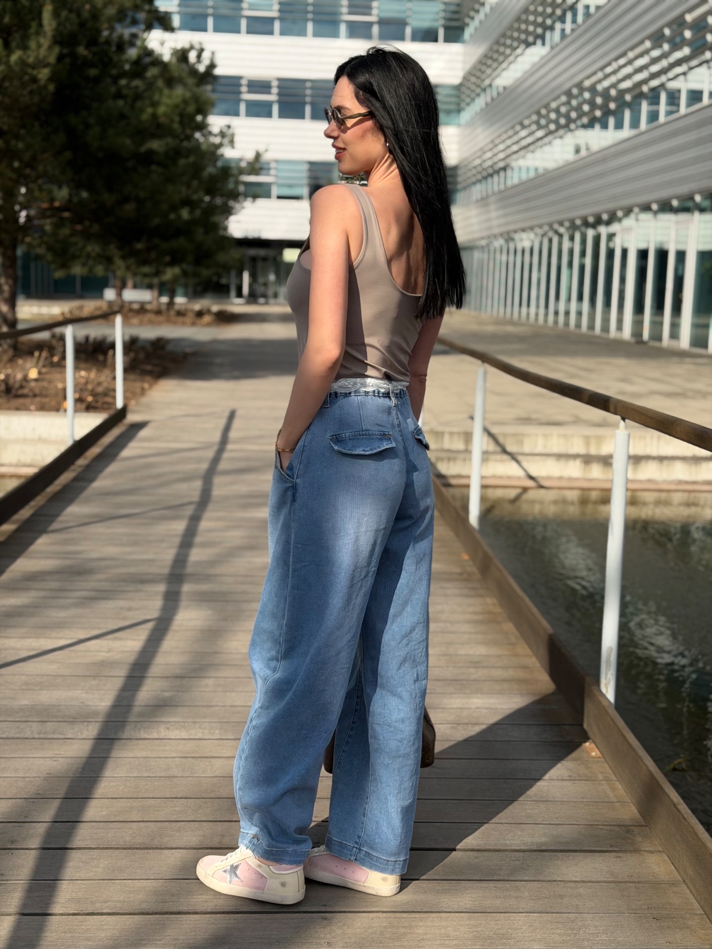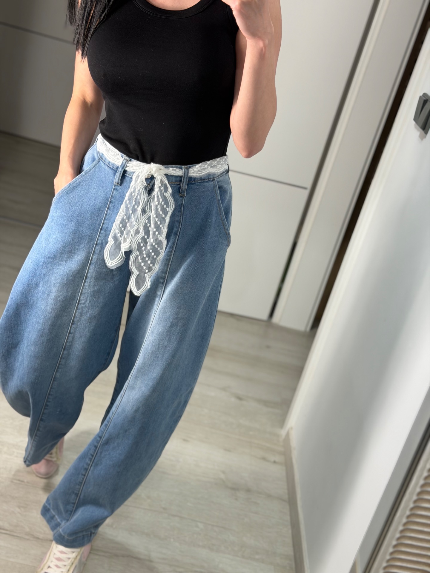 Extra měkké džíny s moderními, širokými nohavicemi, které jsou nyní velký hit. Džíny mají v pase gumu. Kalhoty mají moderní balónovy střih. Modelka běžně nosí vel. XS na 172 cm vysoké postavě na sobě má vel.S