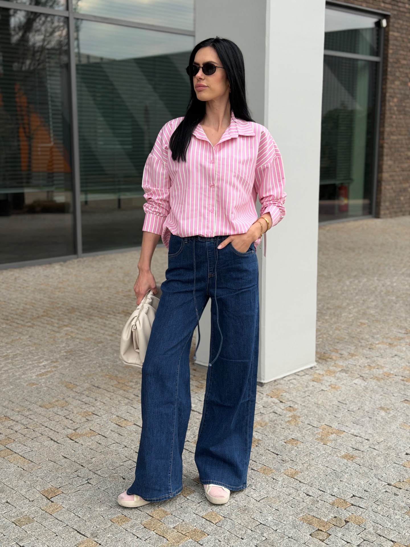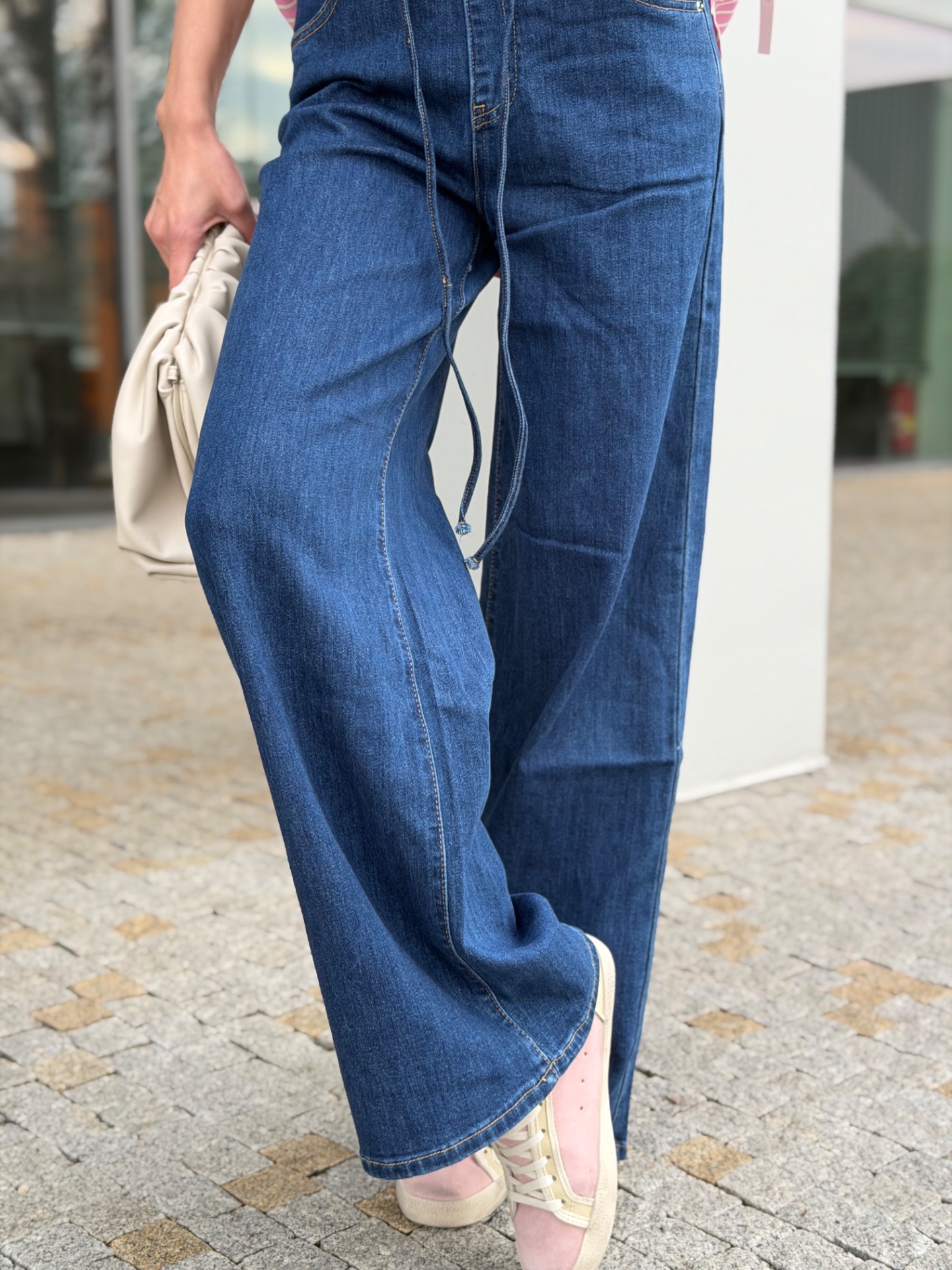 Extra měkké džíny s moderními, širokými nohavicemi, které jsou nyní velký hit. Džíny mají v pase gumu a šňůrku na stažení. Materiál nemačkavý. Skvěle "padnou" každé postavě. Kalhoty mají vyšší pas, který "stahuje bříško". Modelka má na sobě vel.XS na 172 cm vysoké postavě.