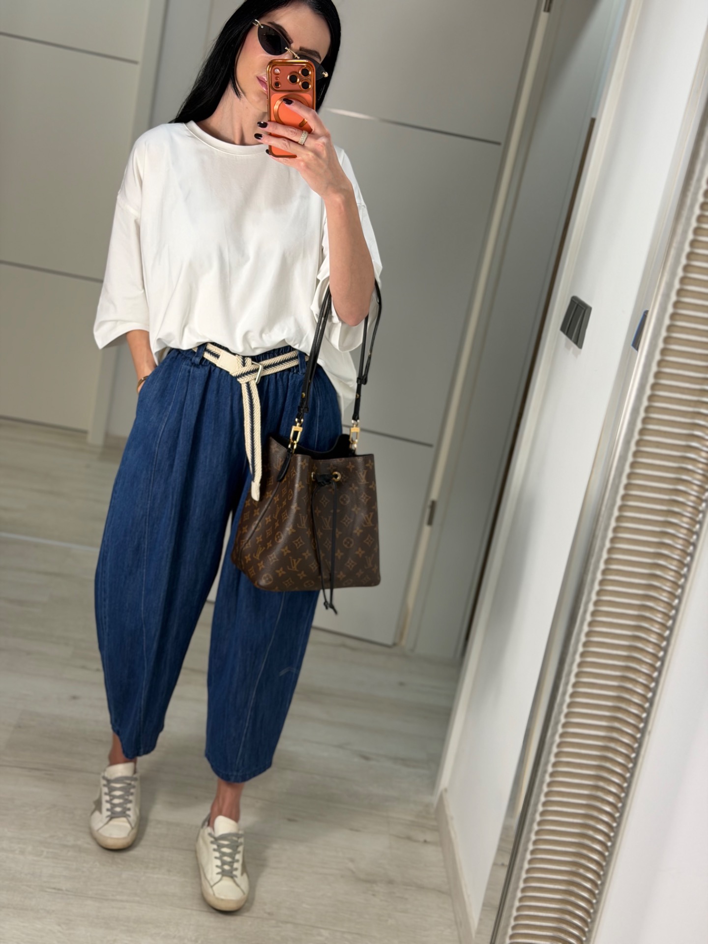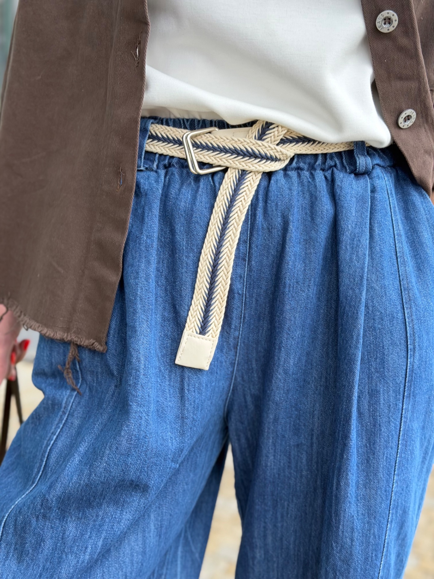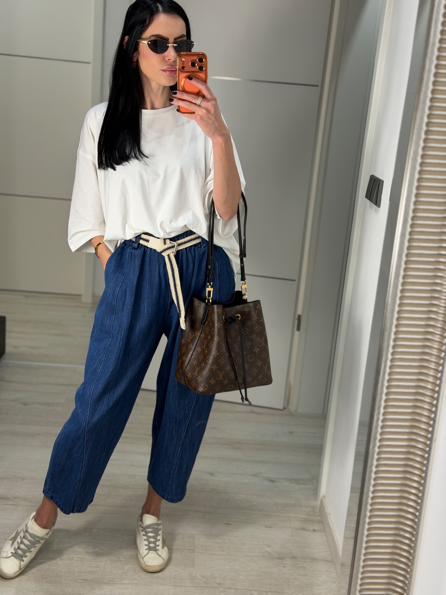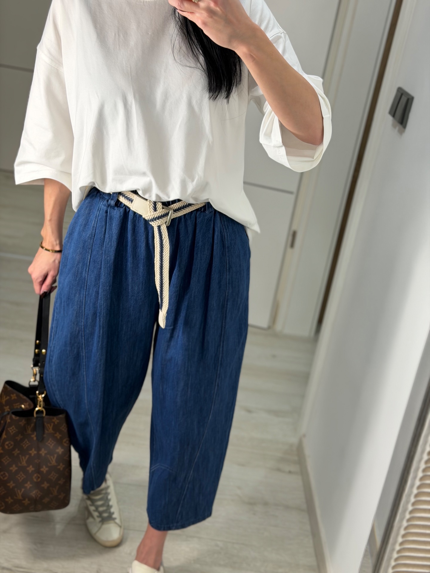 Extra měkké džíny s moderními, širokými nohavicemi, které jsou nyní velký hit. Kalhoty mají moderní balónovy střih a v pase jsou na gumu s páskem. Modelka běžně nosí vel. XS na 172 cm vysoké postavě.