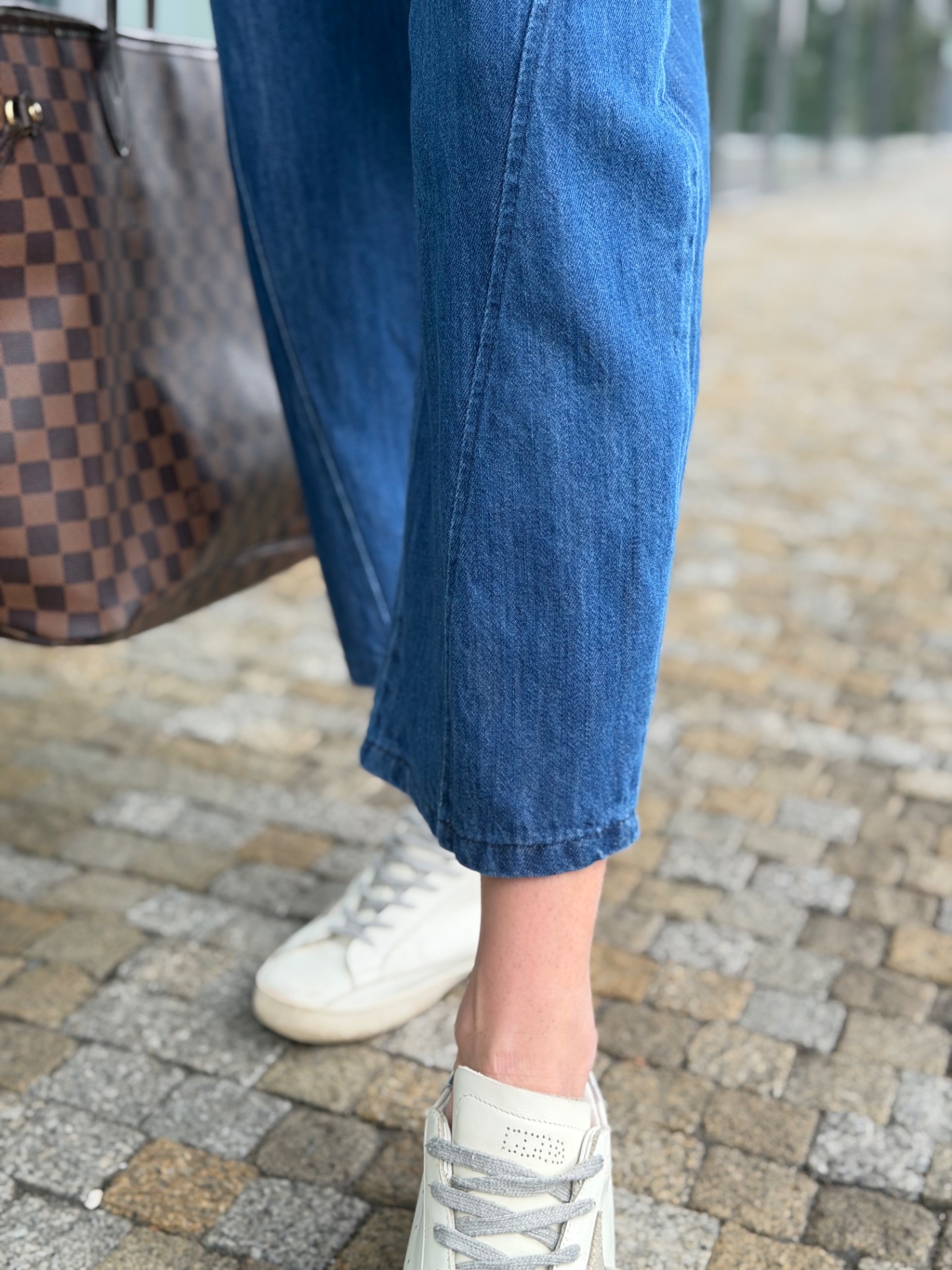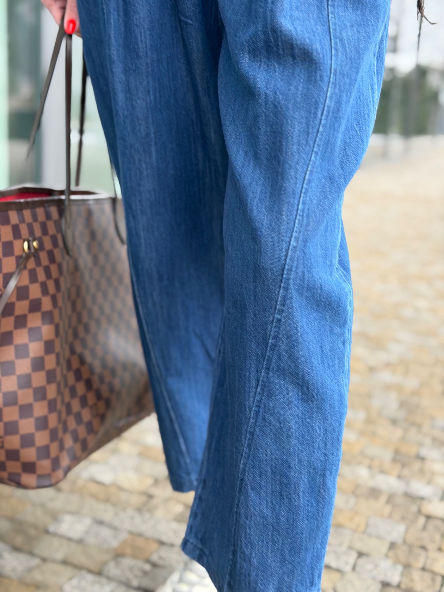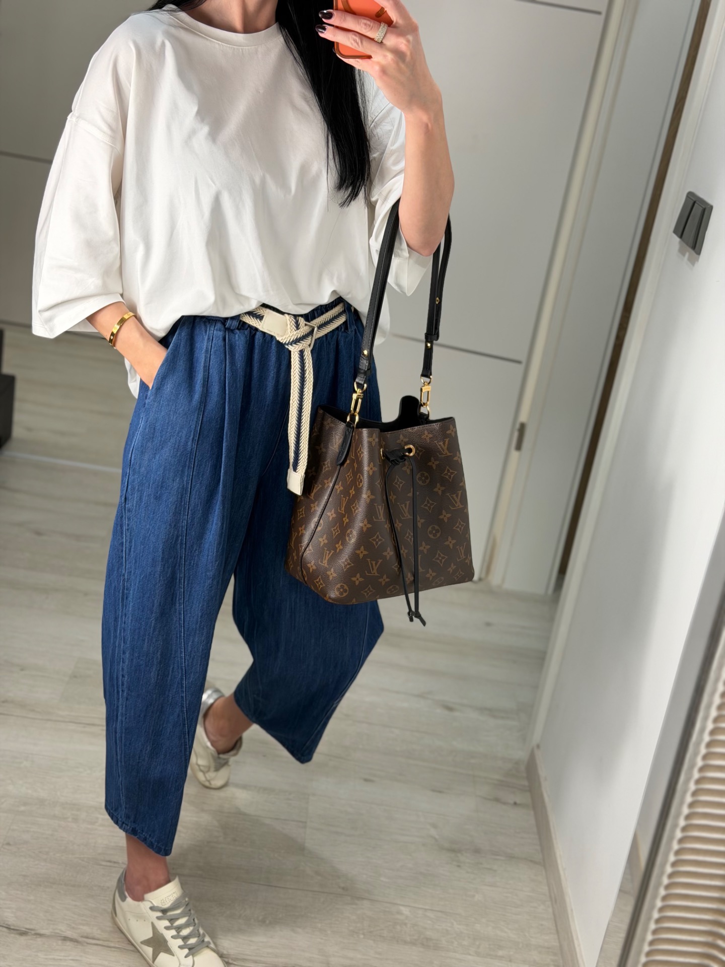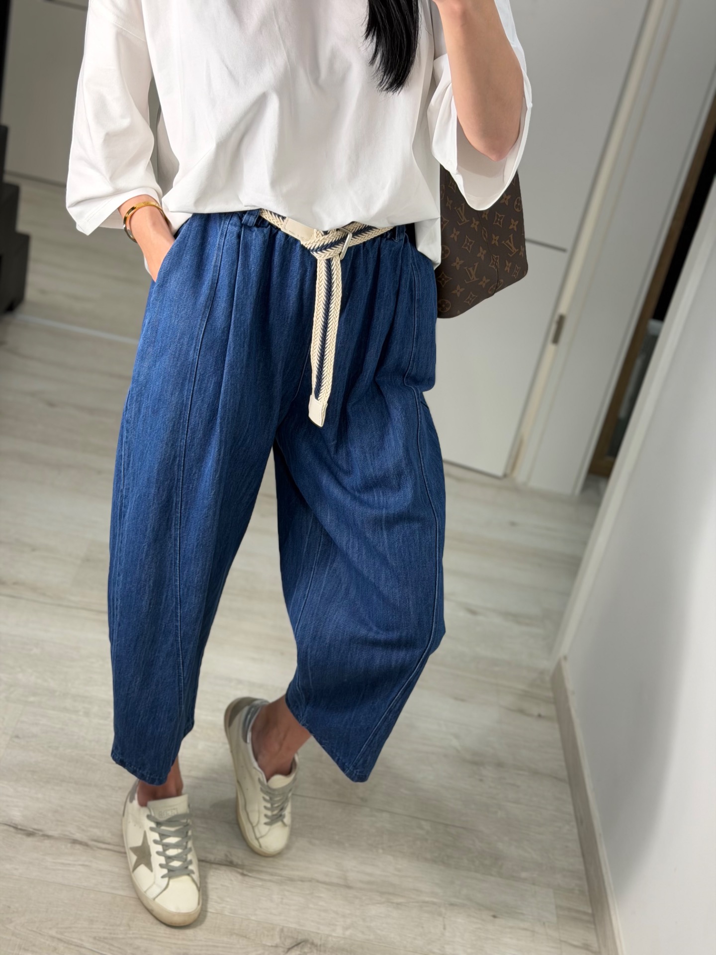 Extra měkké džíny s moderními, širokými nohavicemi, které jsou nyní velký hit. Kalhoty mají moderní balónovy střih a v pase jsou na gumu s páskem. Modelka běžně nosí vel. XS na 172 cm vysoké postavě.