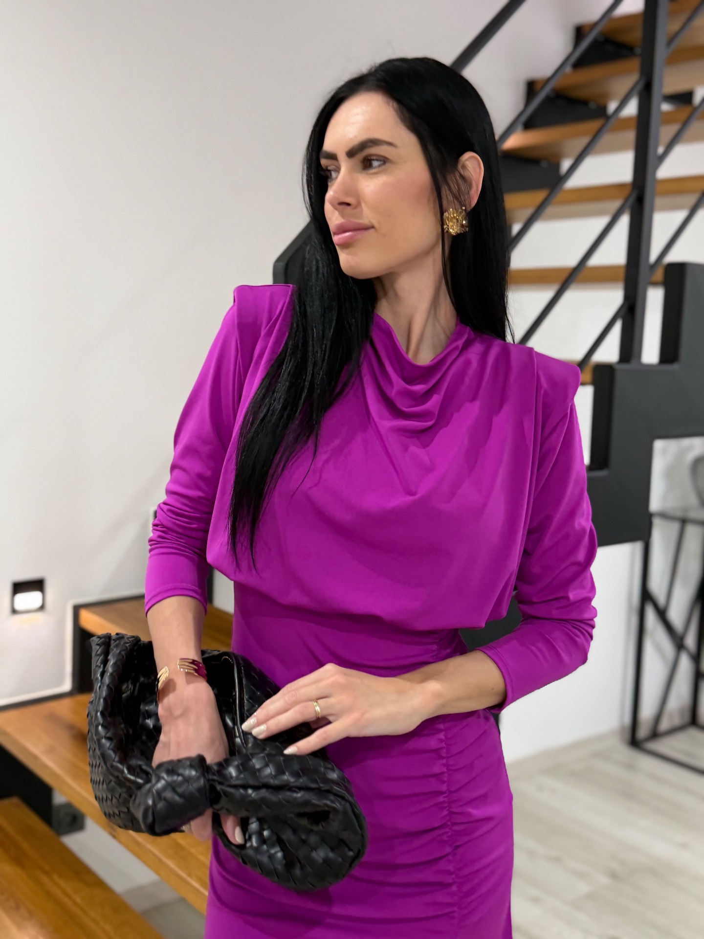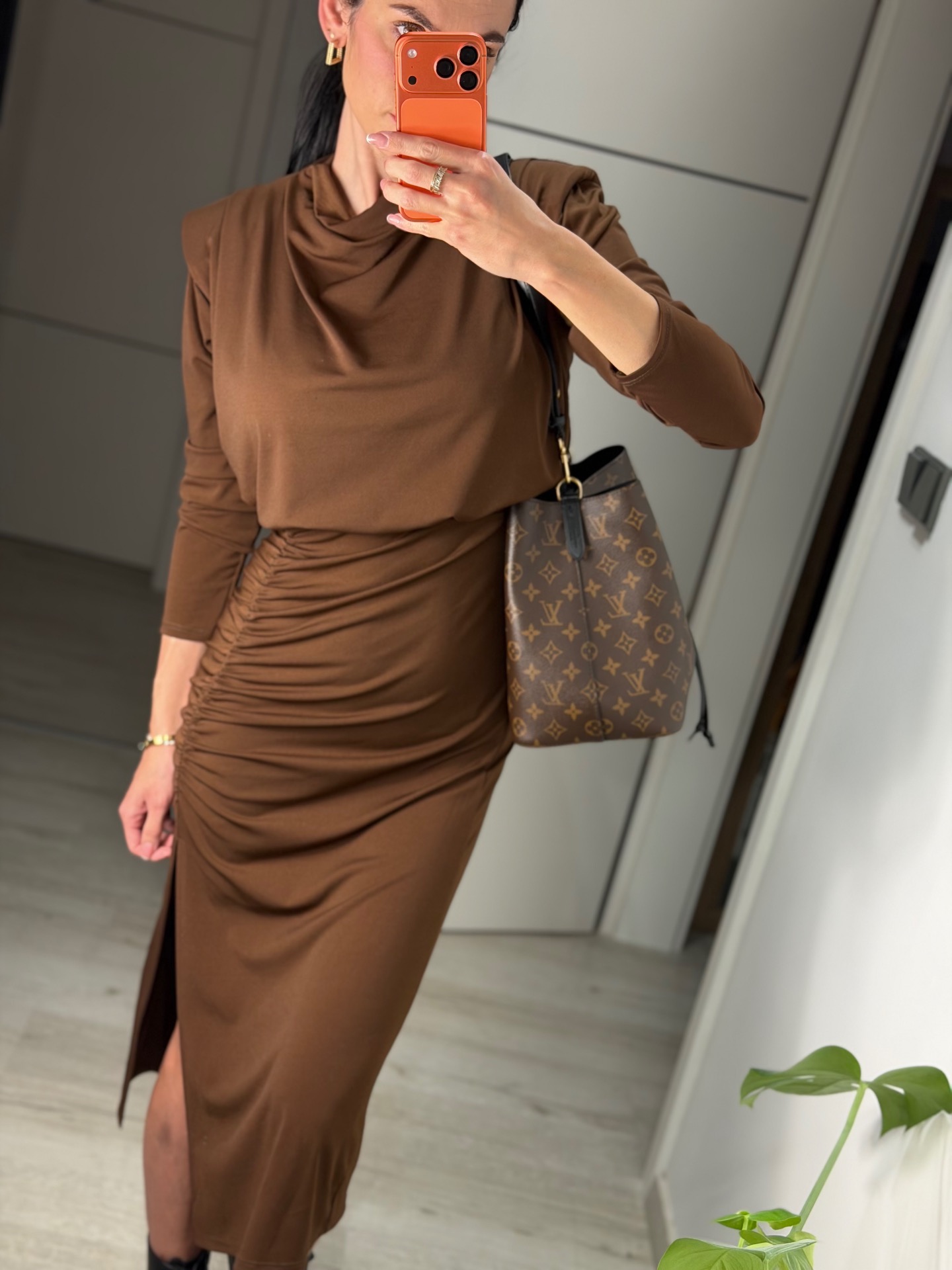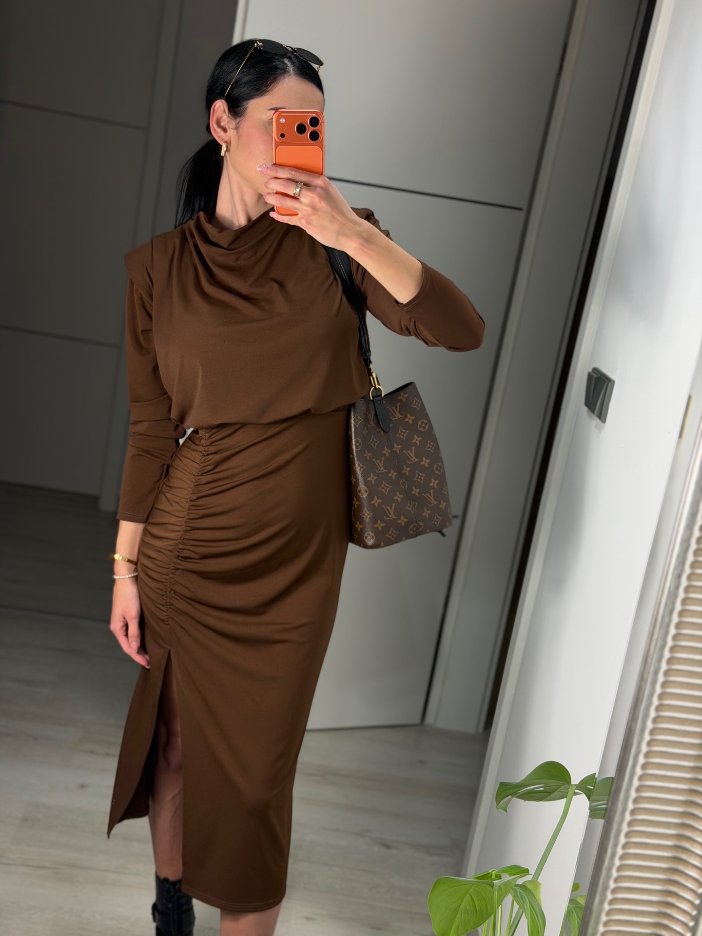 Elastické šaty v moderní midi délce. Šaty "dělají krásnou ženskou siluetu". Řasení v pase. Splývavý a nemačkavý materiál. Šaty mají decentní rozparek. Extra pružný materiál.