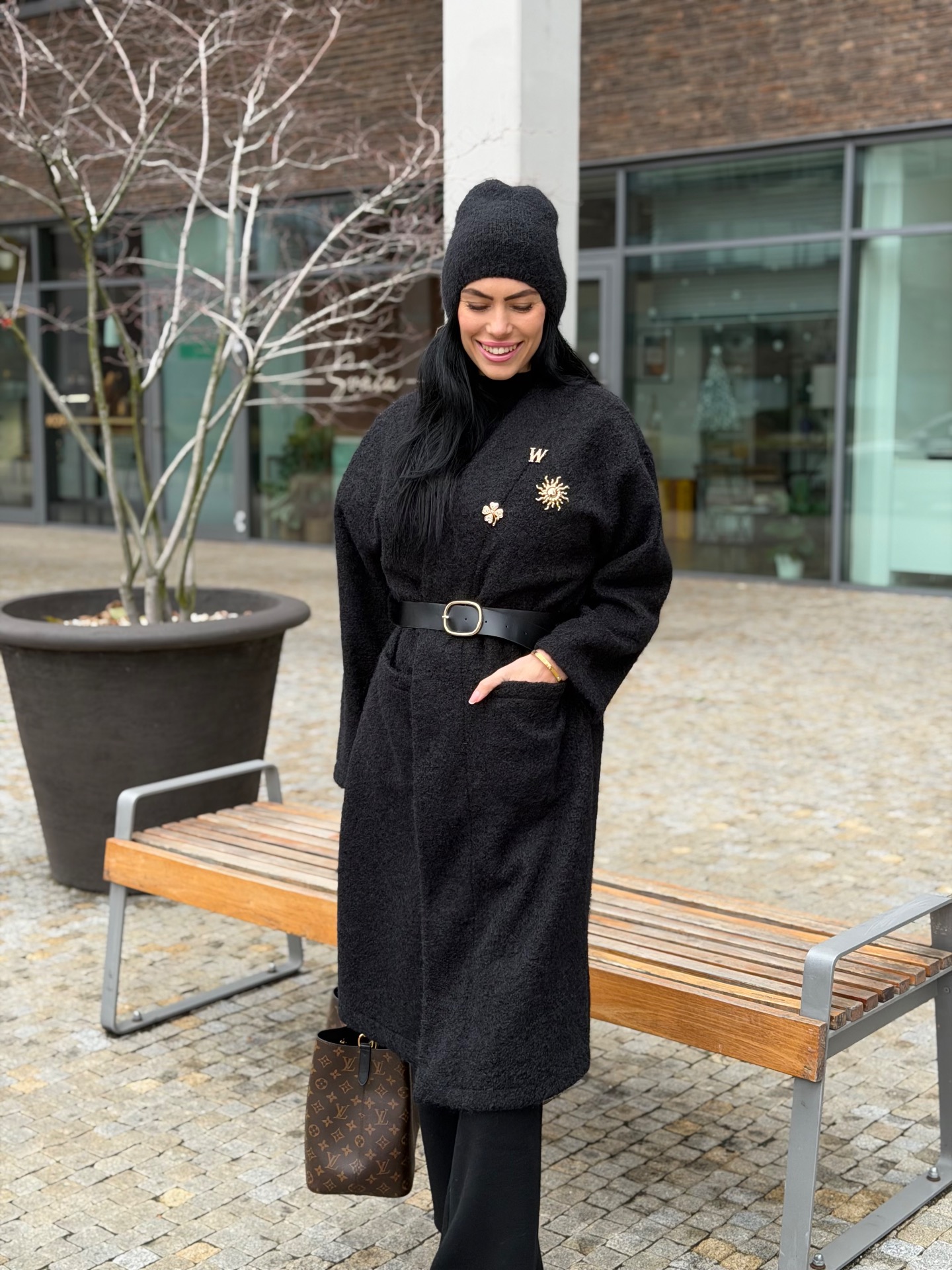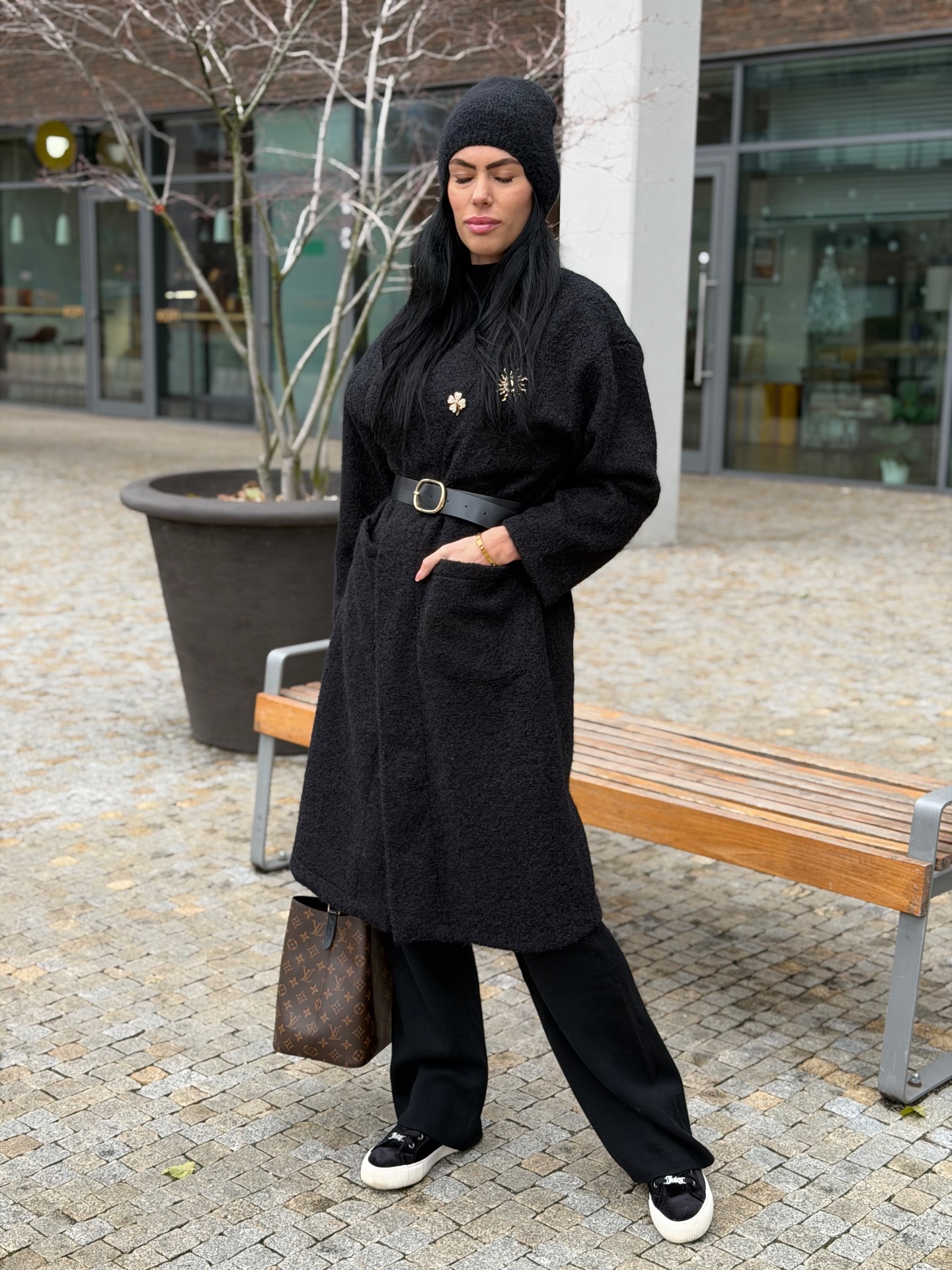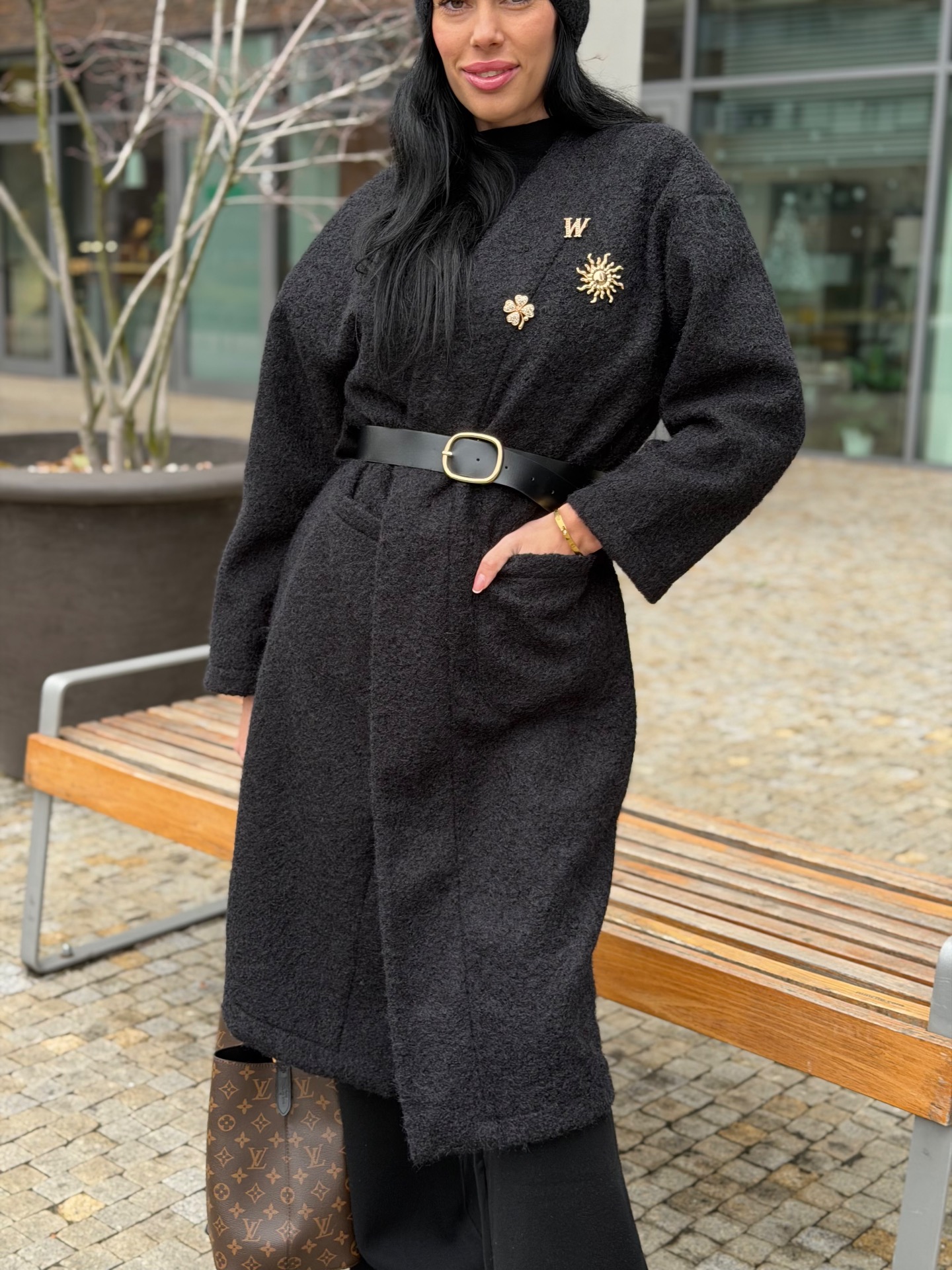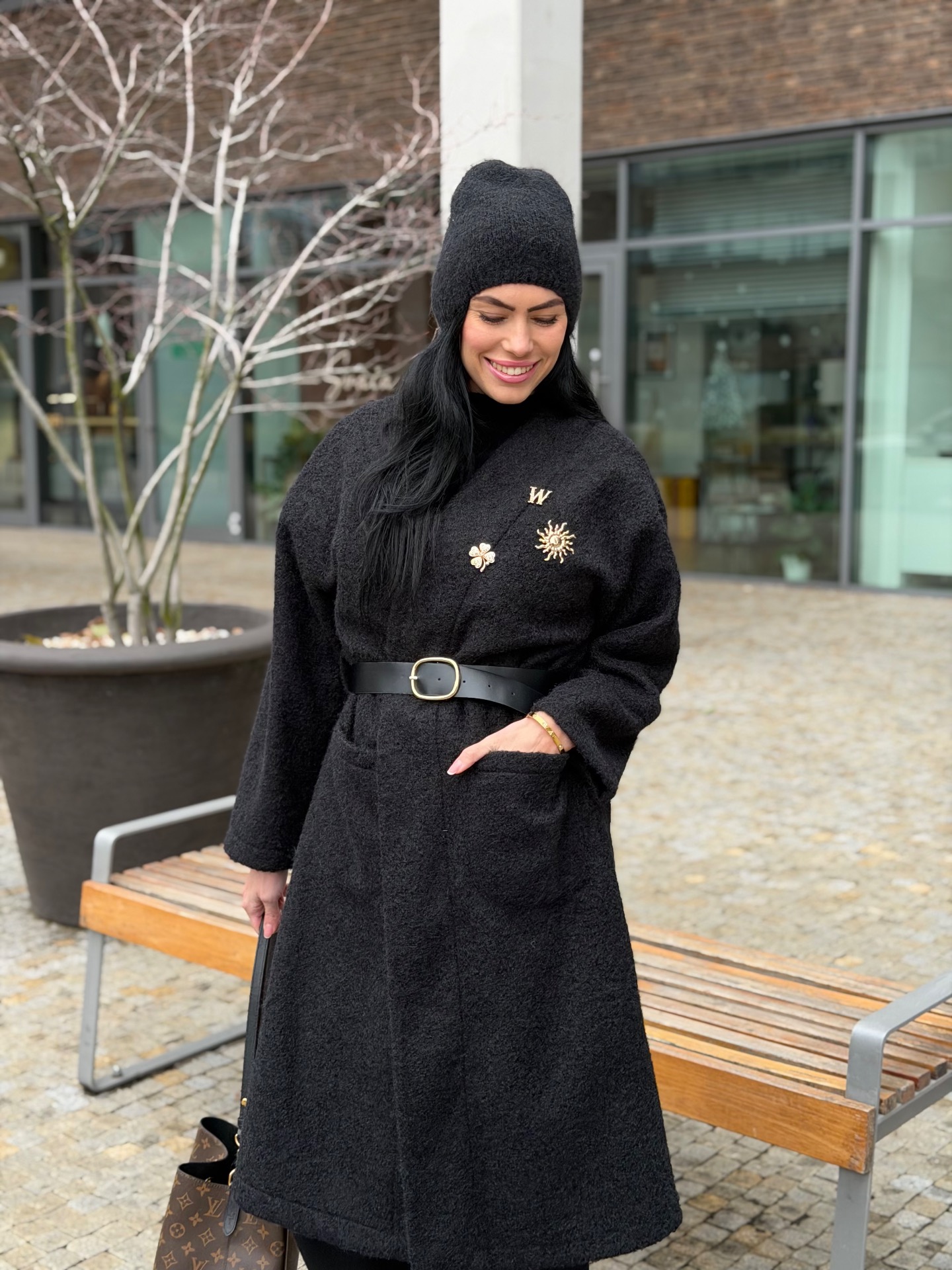 Teplý kabát z měkkého, velmi "poddajného" materiálu. Kabát má měkky a teplý fleese. Zapínání na pásek, který je součástí kabátu. Brože lze jednoduše odepnout. Foceno na postavě XS/172 cm. Vhodný XS-L.