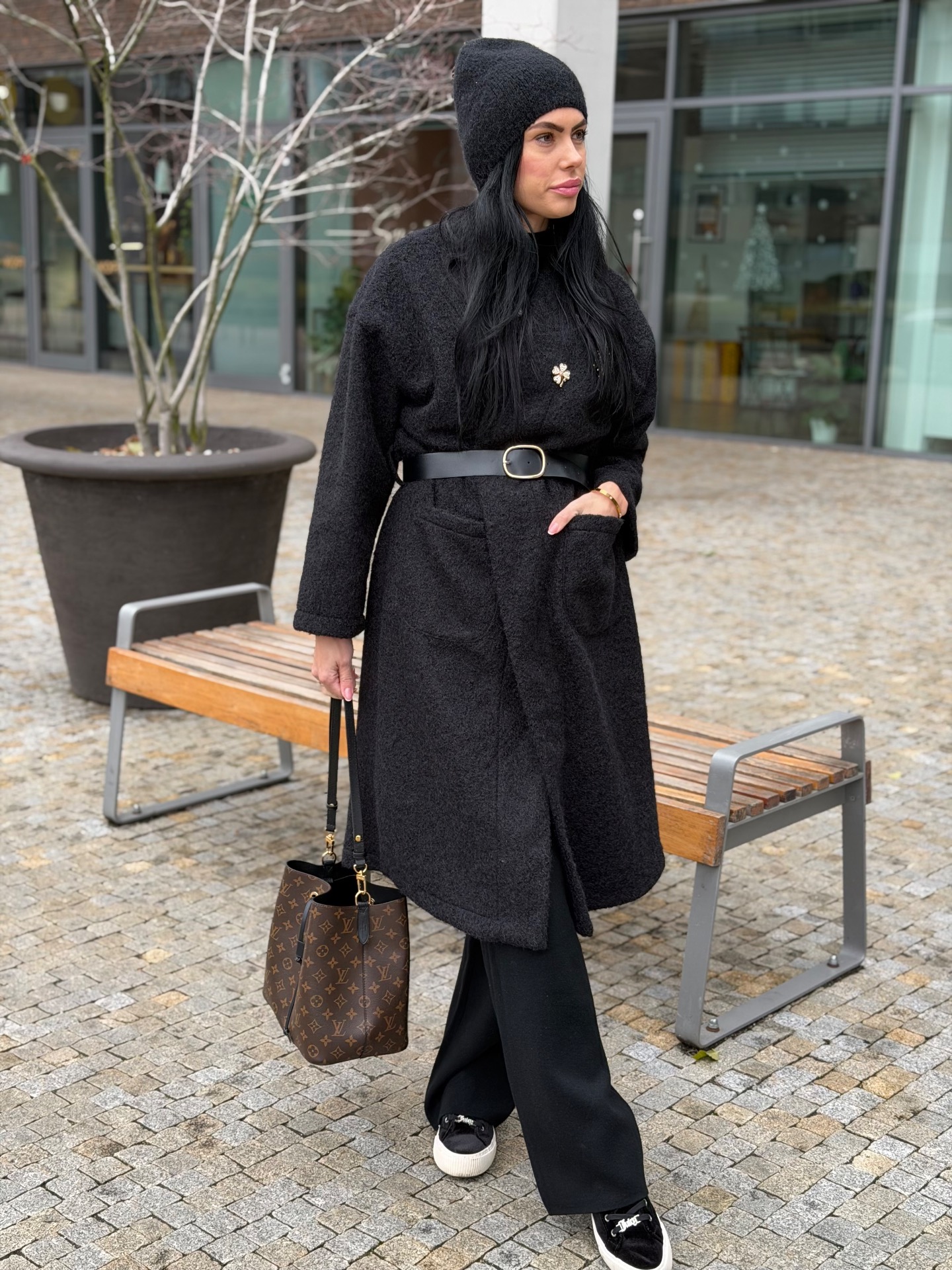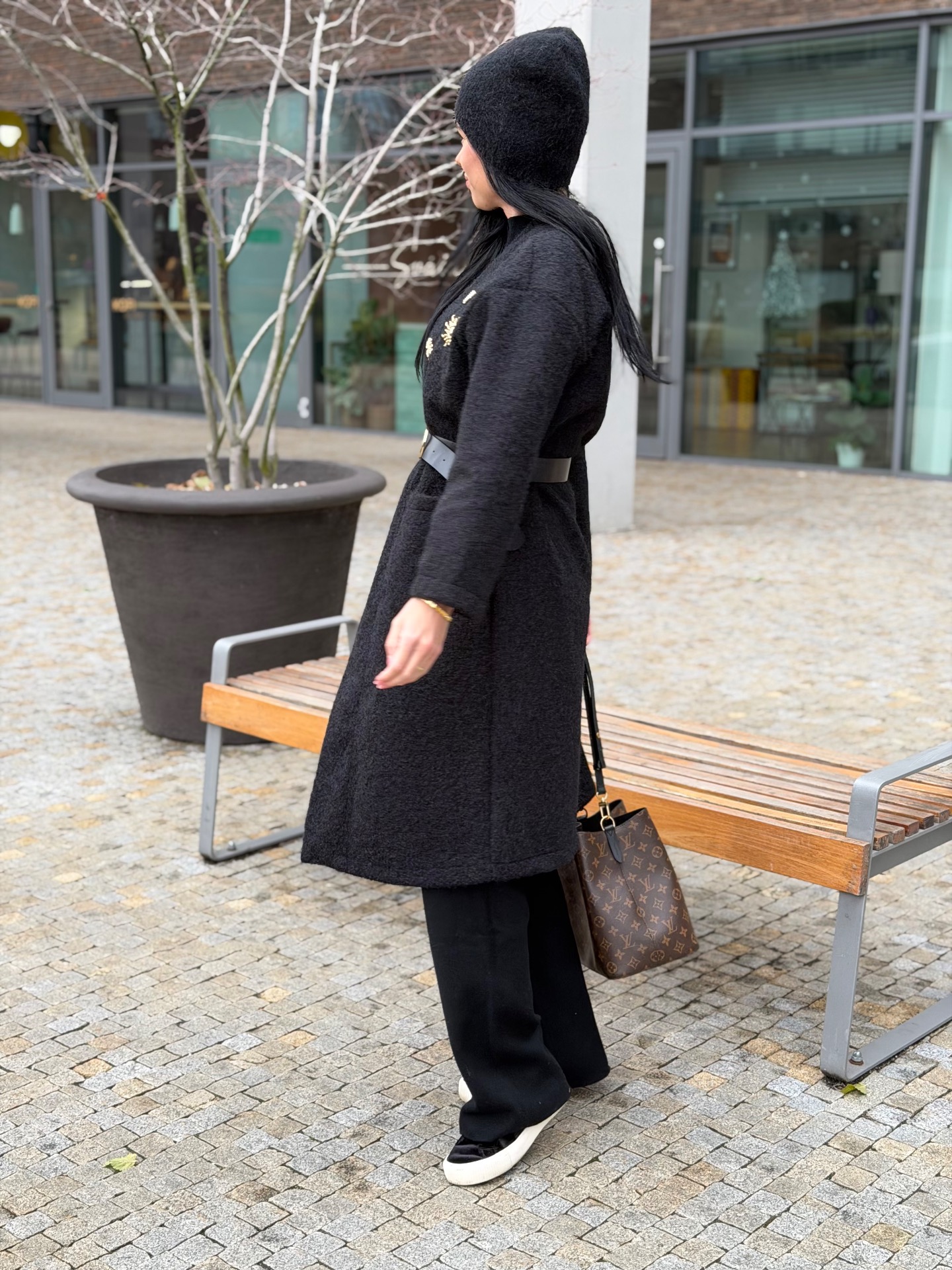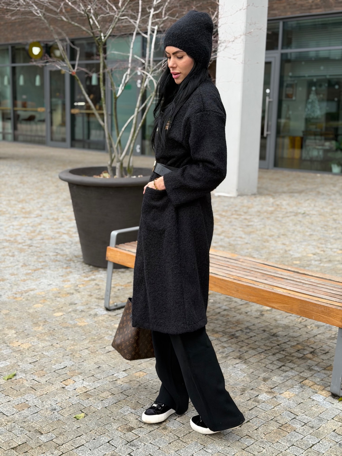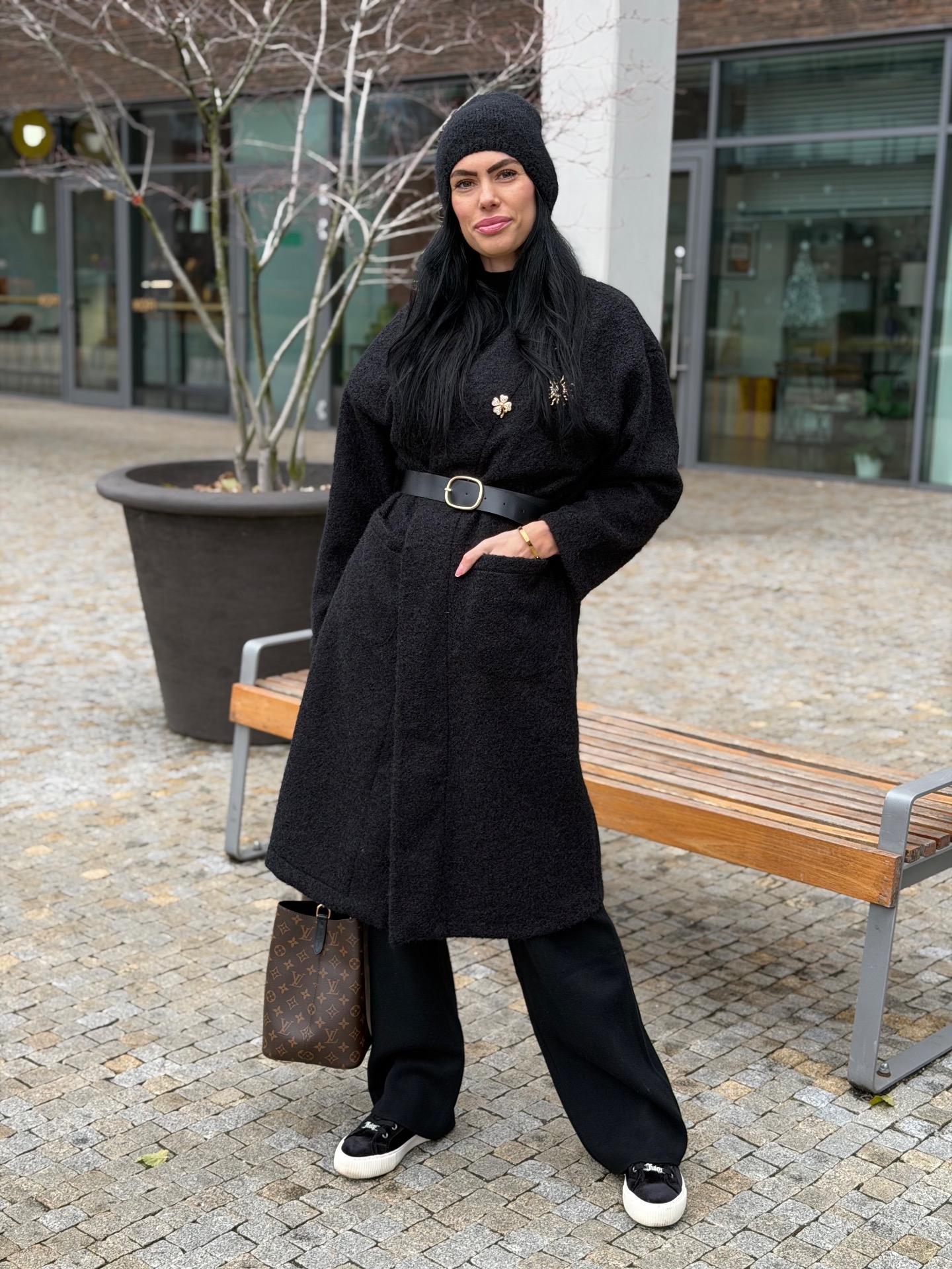 Teplý kabát z měkkého, velmi "poddajného" materiálu. Kabát má měkky a teplý fleese. Zapínání na pásek, který je součástí kabátu. Brože lze jednoduše odepnout. Foceno na postavě XS/172 cm. Vhodný XS-L.
