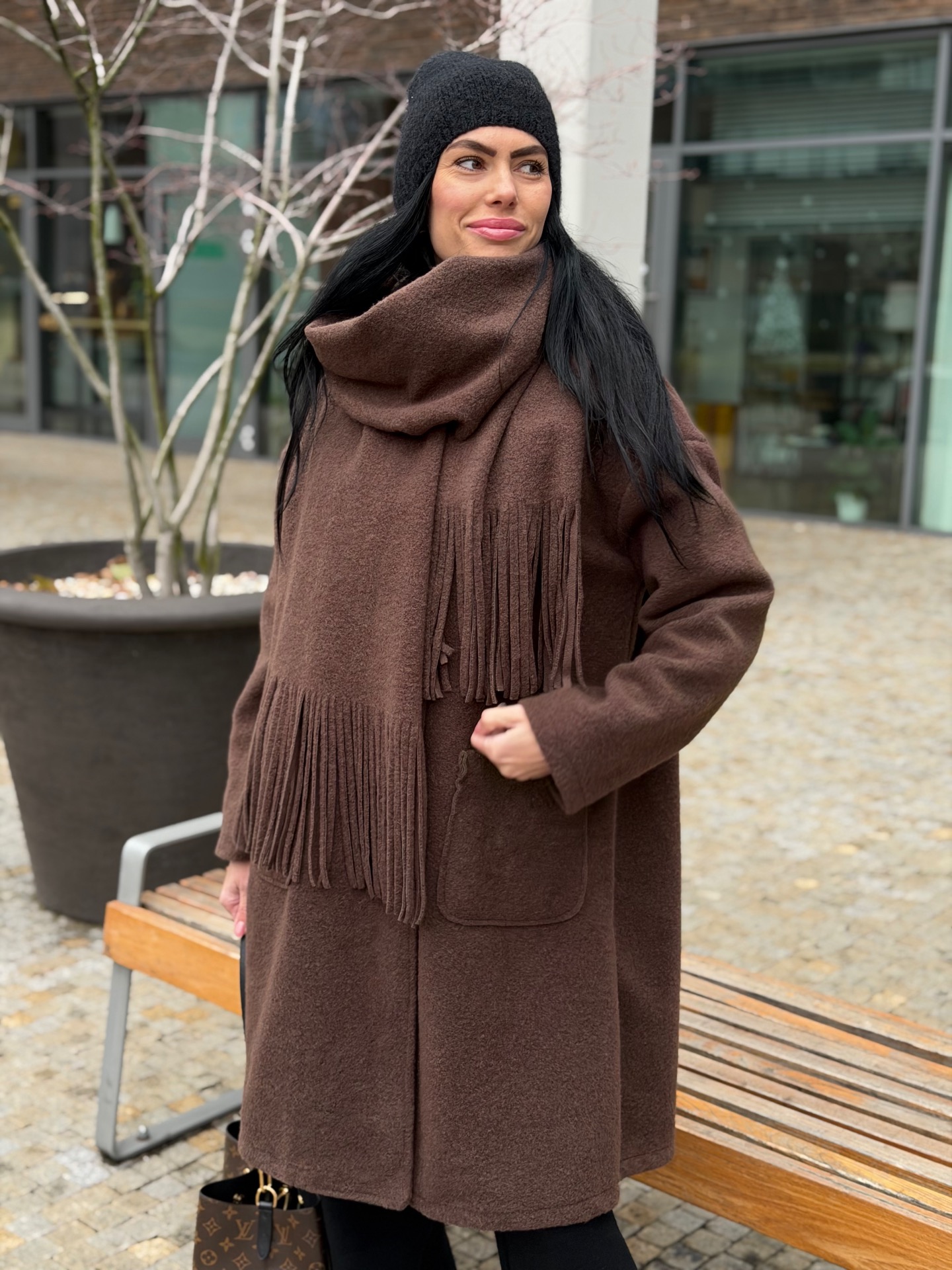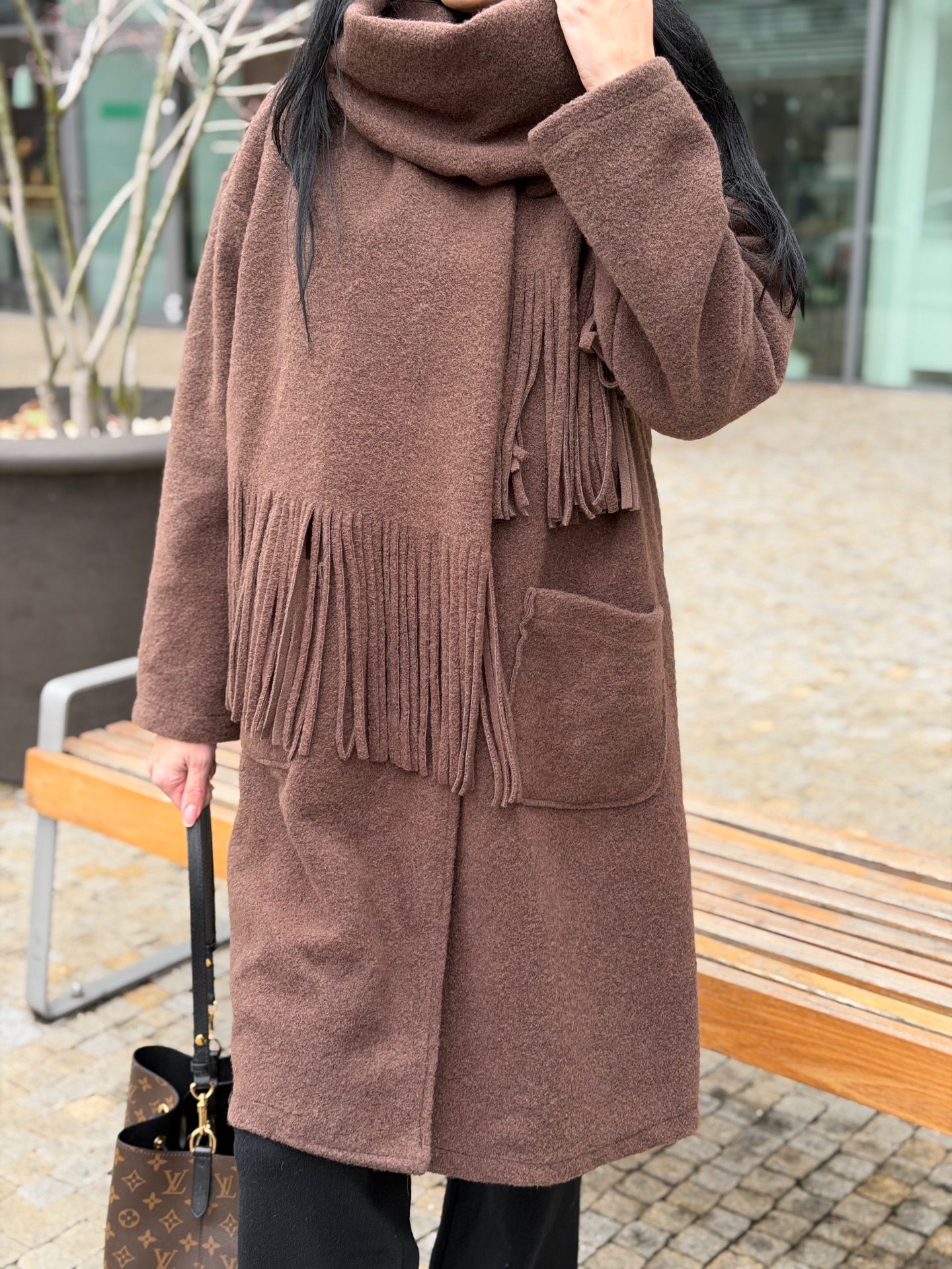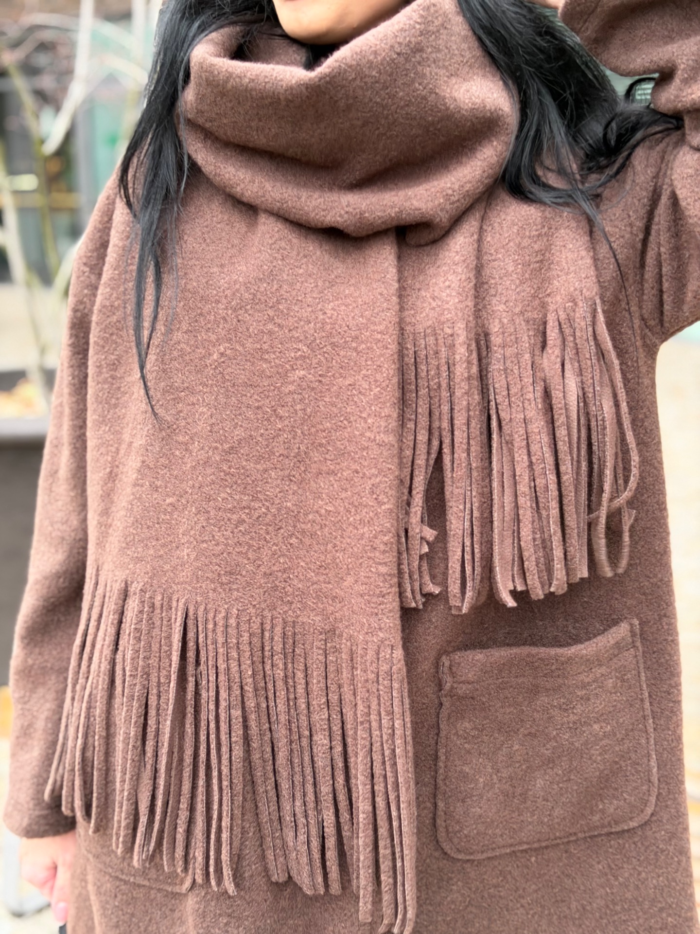 Teplý kabát z měkkého, velmi "poddajného" materiálu. Kabát má měkky a teplý fleese. Zapínání na knoflíky a součástí je i velká šála s třásněmi. Foceno na postavě XS/172 cm. Vhodný XS-L.