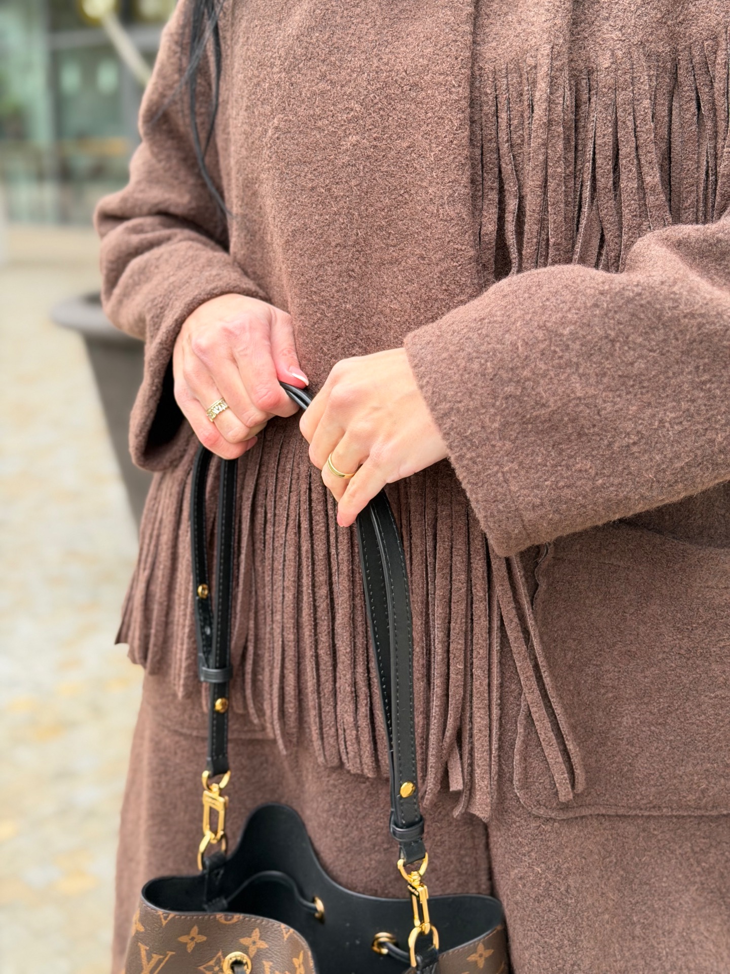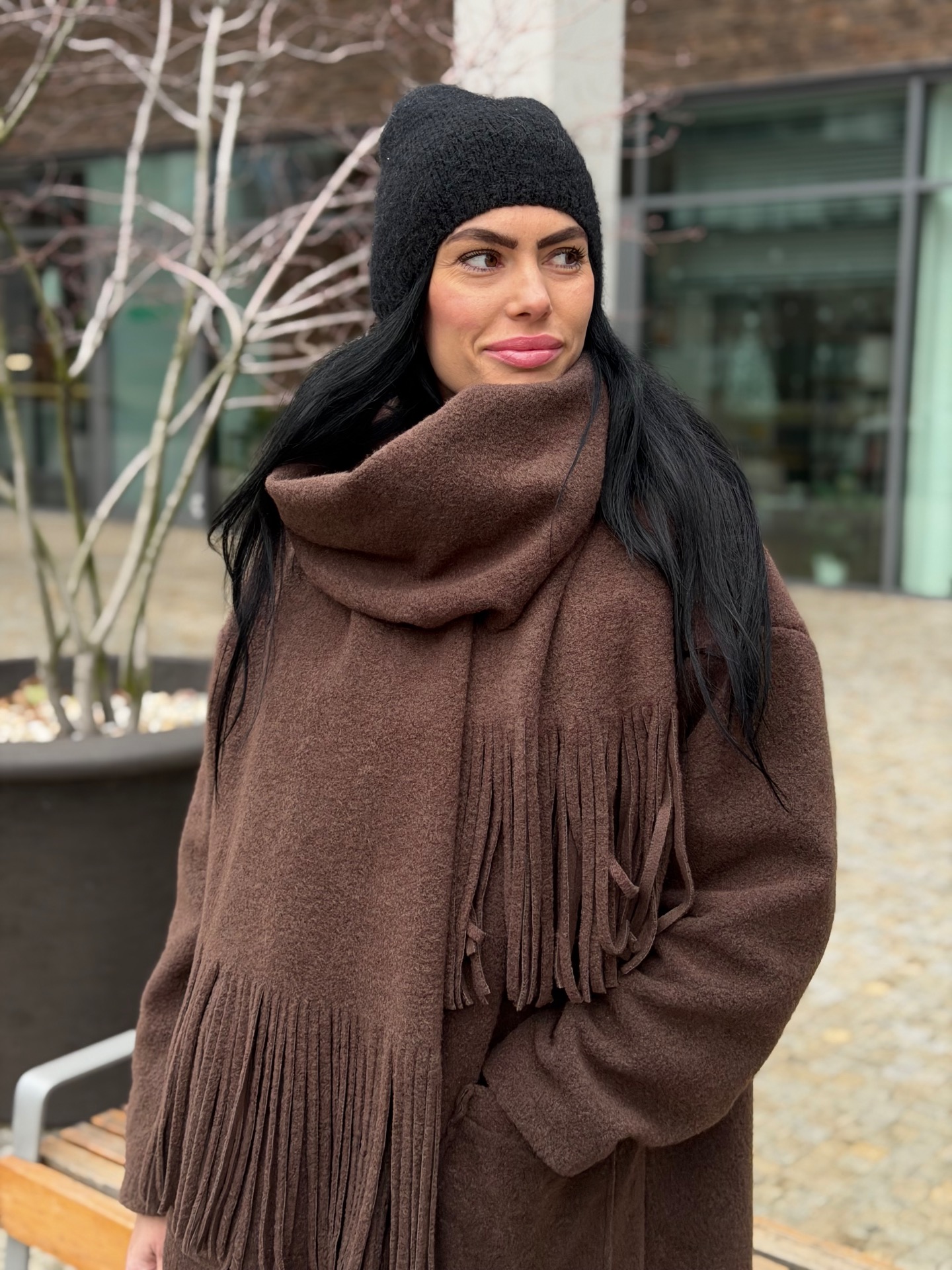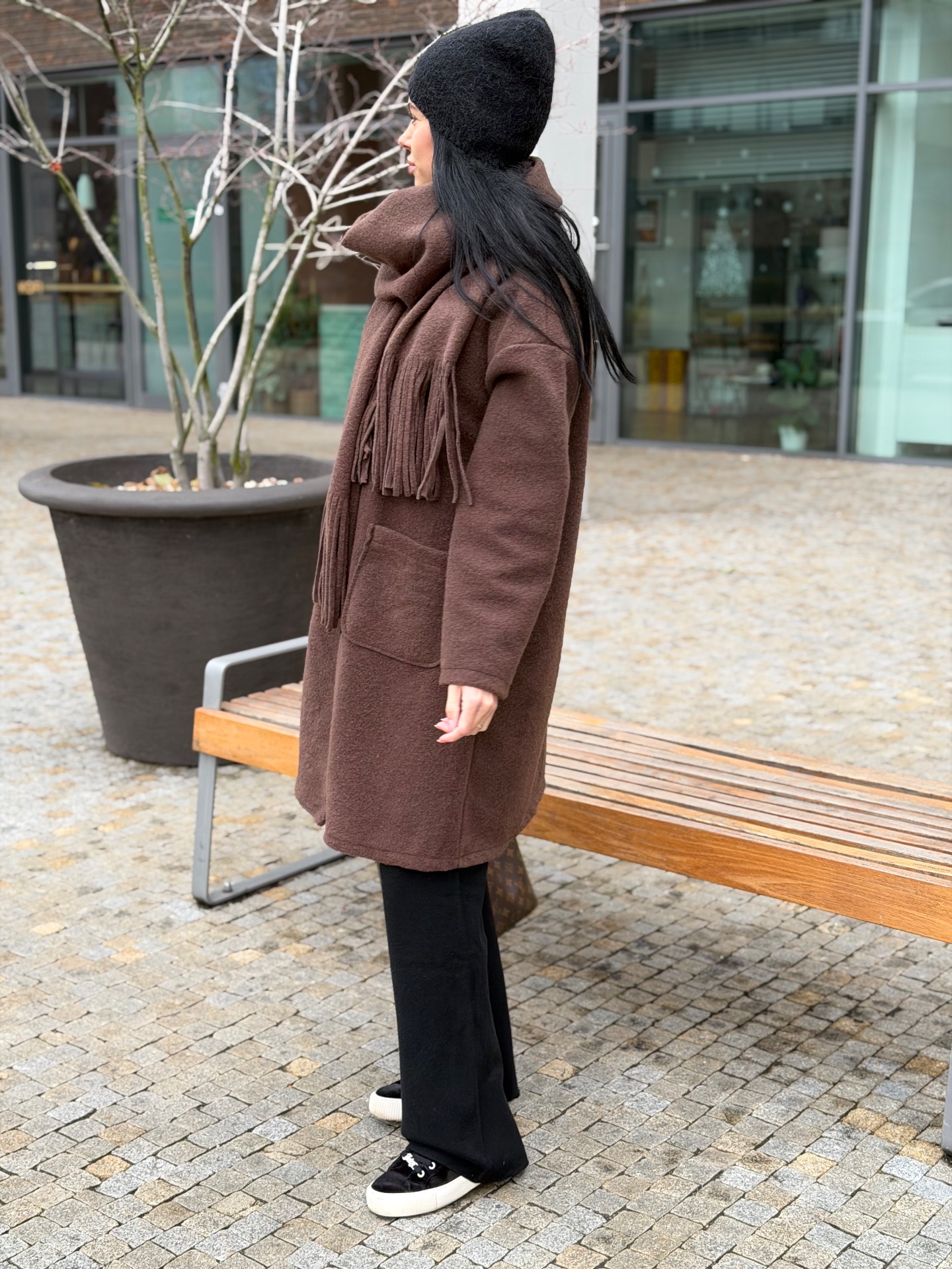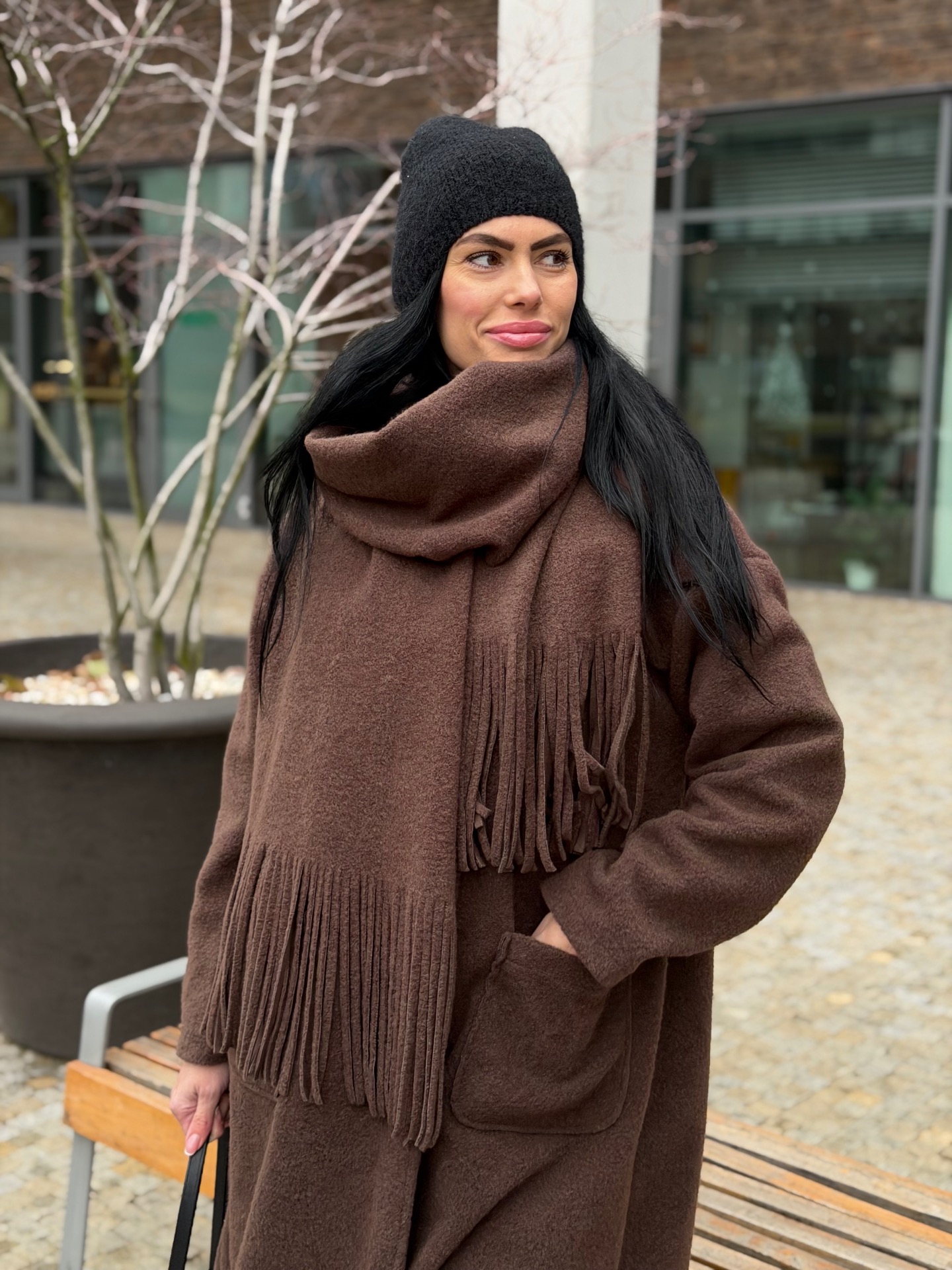 Teplý kabát z měkkého, velmi "poddajného" materiálu. Kabát má měkky a teplý fleese. Zapínání na knoflíky a součástí je i velká šála s třásněmi. Foceno na postavě XS/172 cm. Vhodný XS-L.