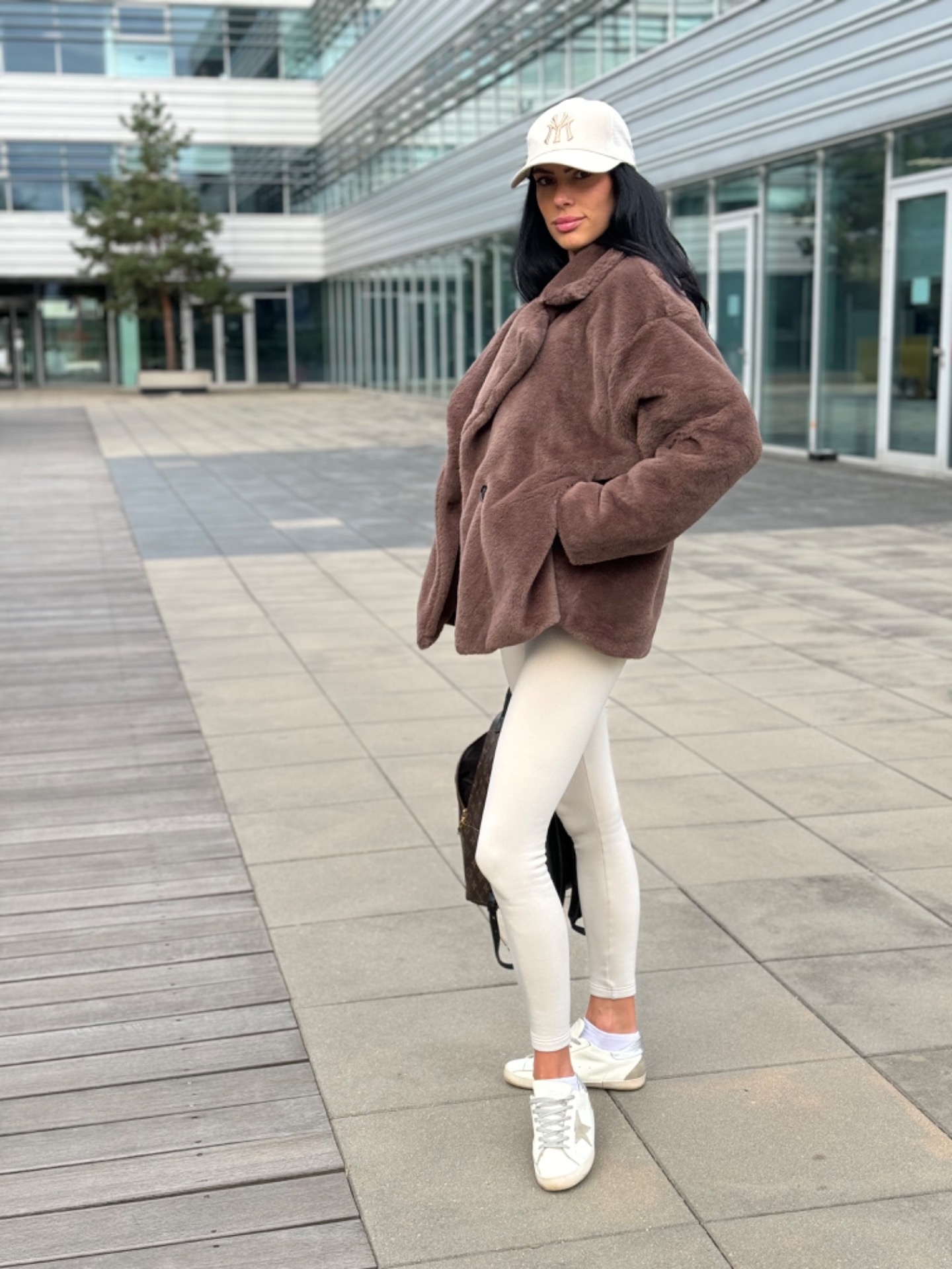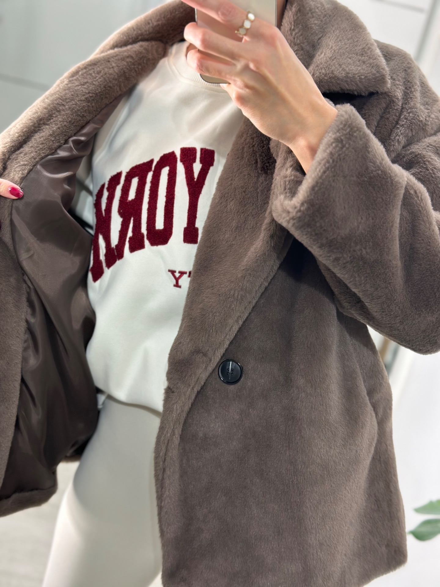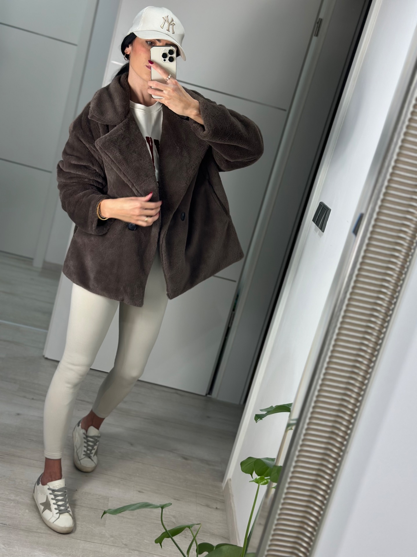 Teddy kabát z měkkého, velmi "poddajného" materiálu. Kabát má límeček. Zapínání na knoflíky. Je s podšívkou. Foceno na postavě XS/172 cm. Vhodný XS-L.