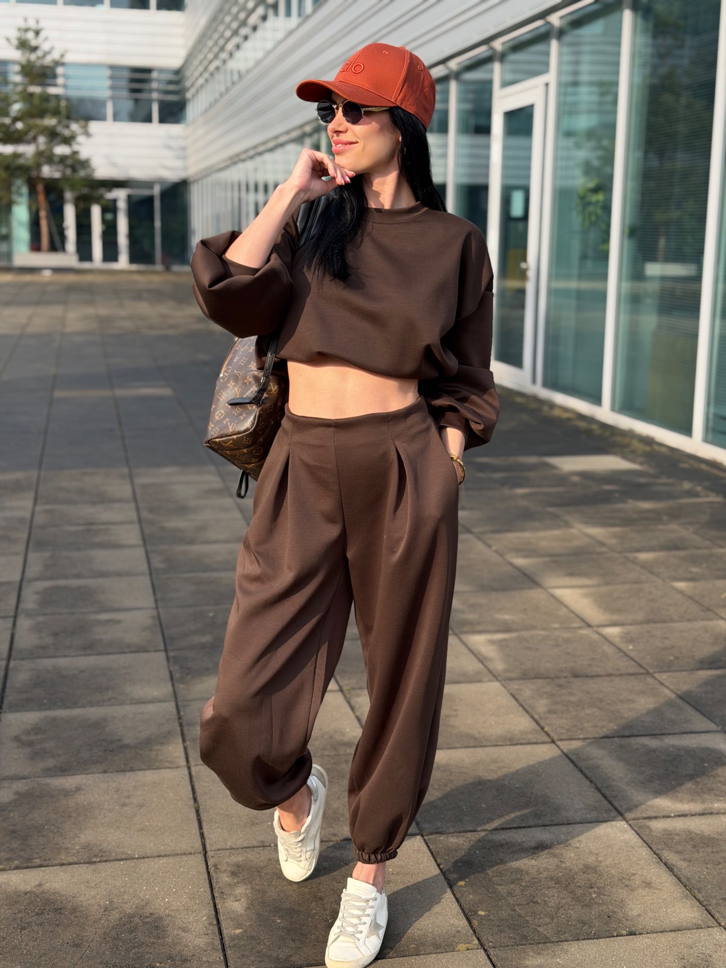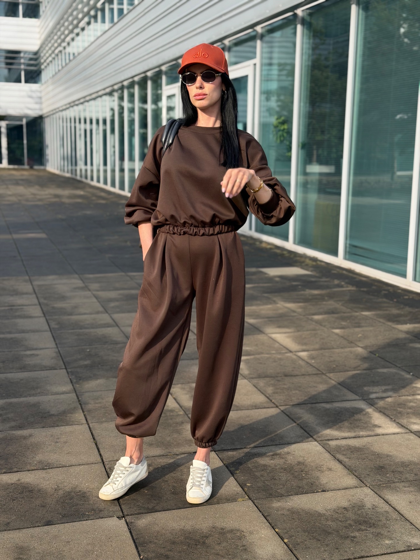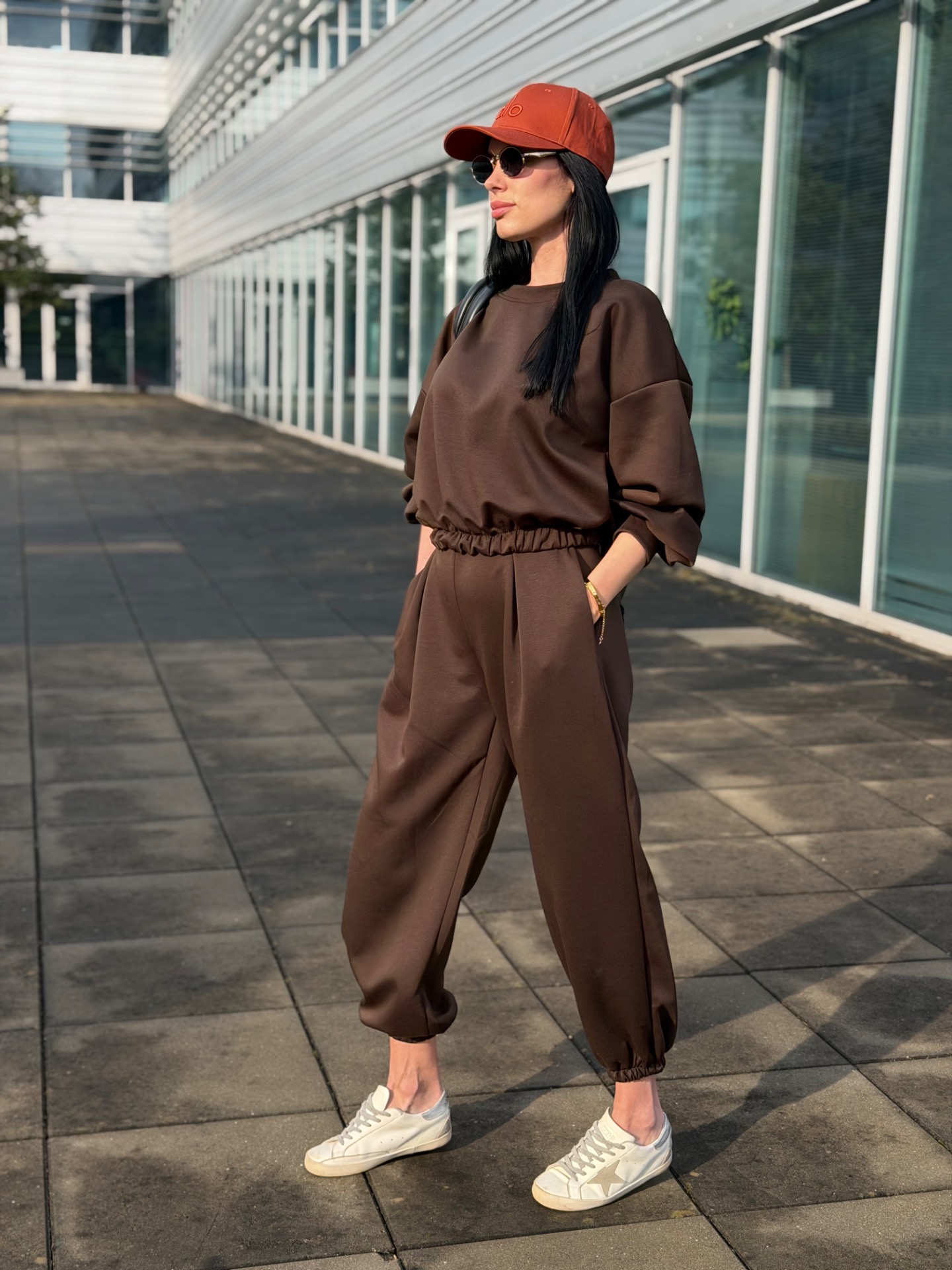 Nádherný komplet z pružného materiálu. Skvělý střih kalhot "sedne" každé postavě - kalhoty v pase a u kotníků na gumu . Mikina ve volném střihu s gumou v pase. Foceno na postavě XS/172 cm. Komplet "sedne" XS-L. V nabídce ve více barvách.