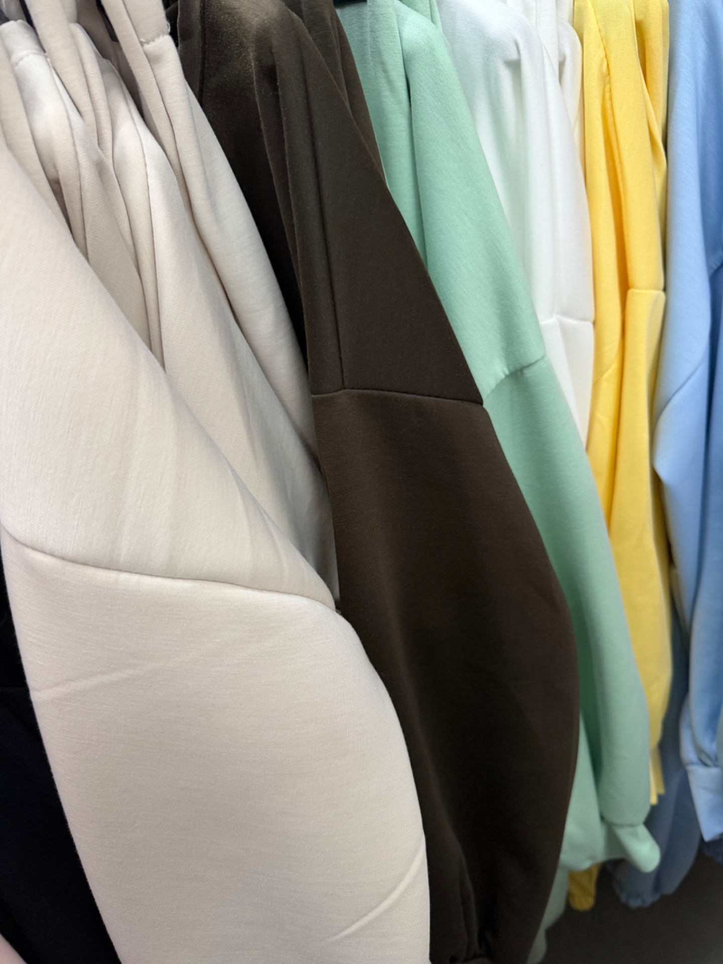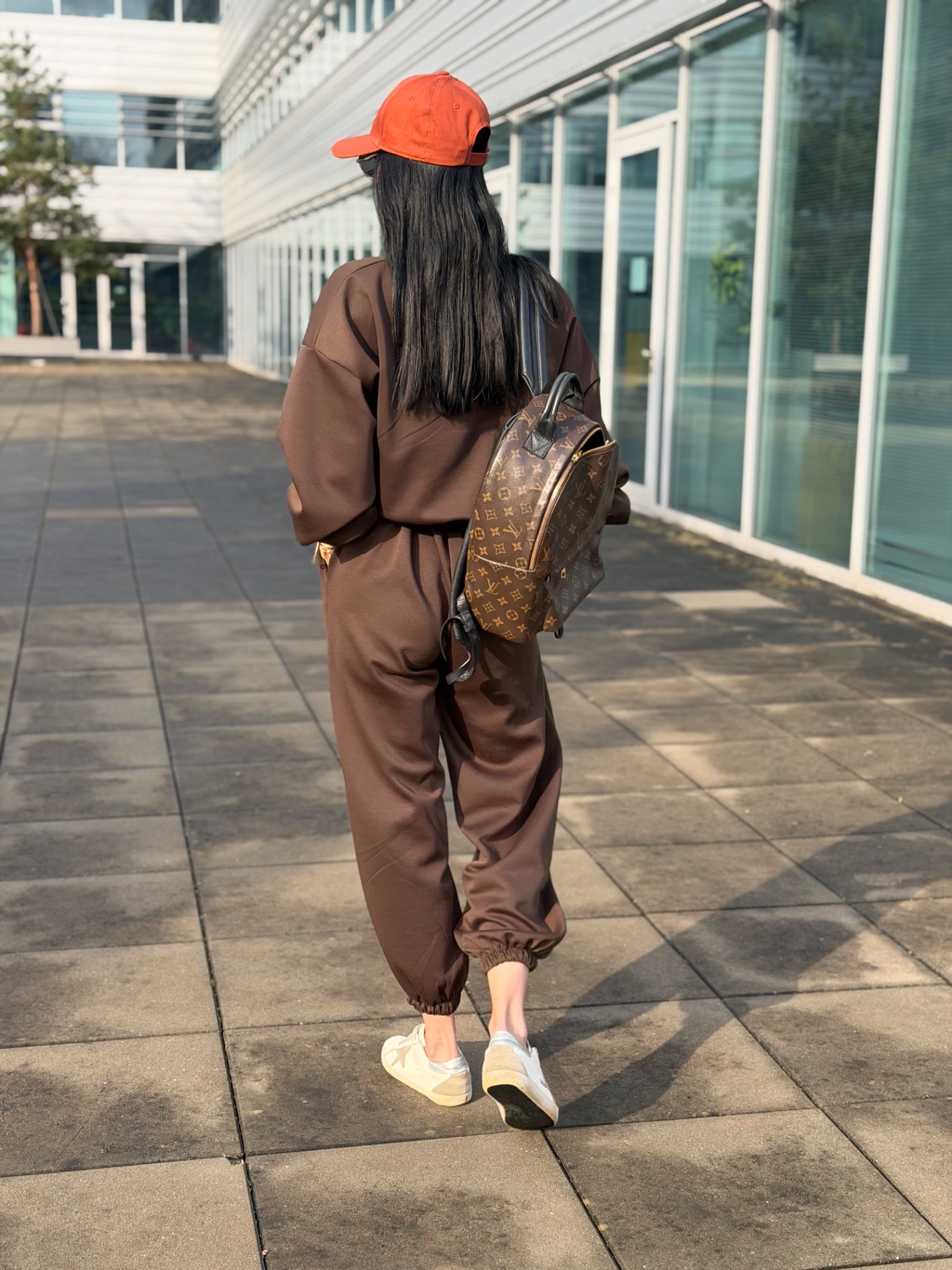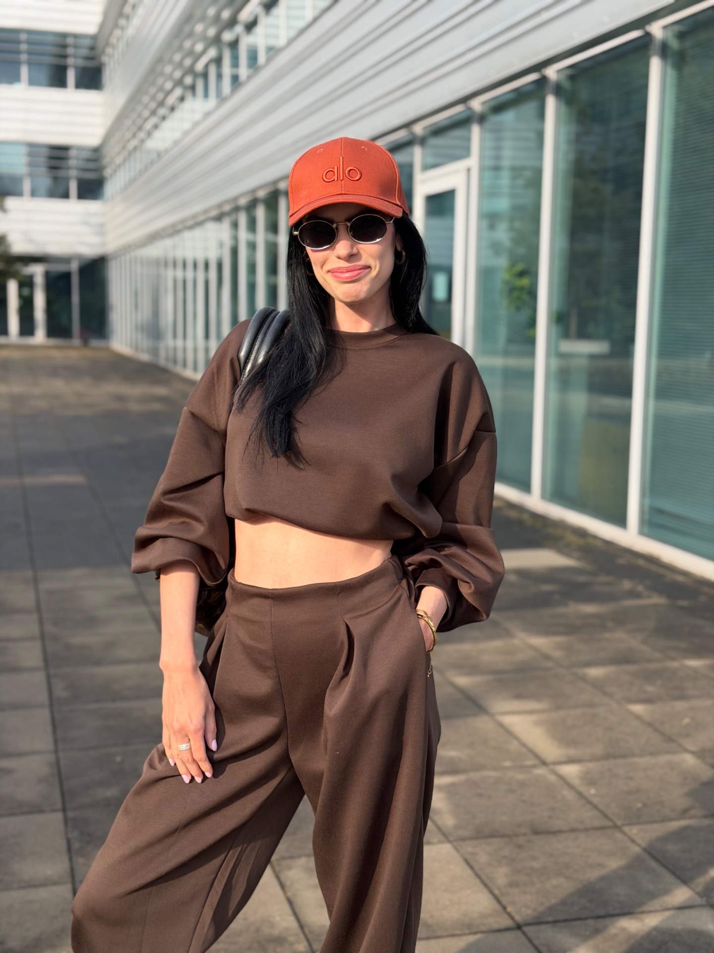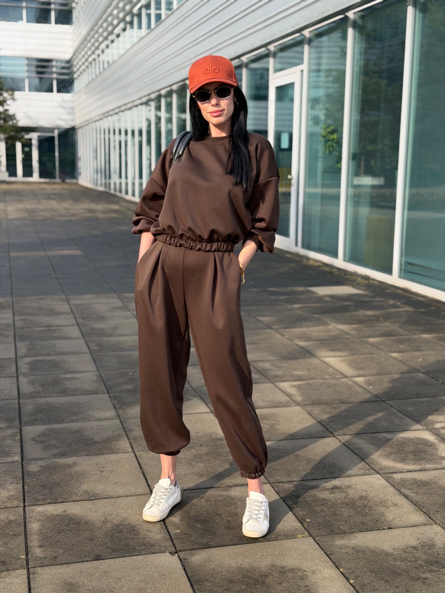 Nádherný komplet z pružného materiálu. Skvělý střih kalhot "sedne" každé postavě - kalhoty v pase a u kotníků na gumu . Mikina ve volném střihu s gumou v pase. Foceno na postavě XS/172 cm. Komplet "sedne" XS-L. V nabídce ve více barvách.