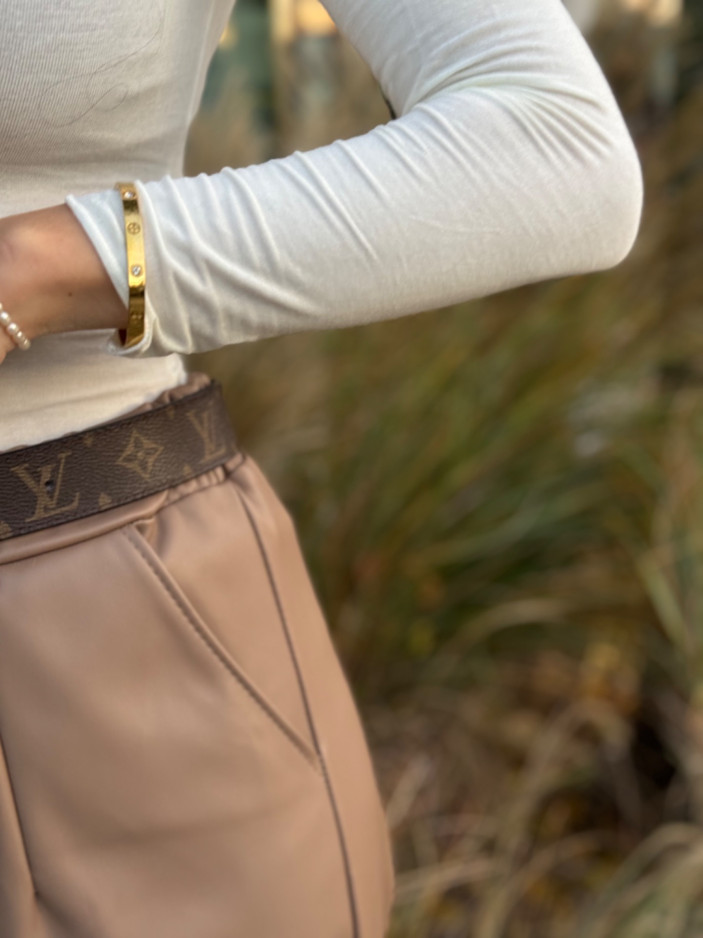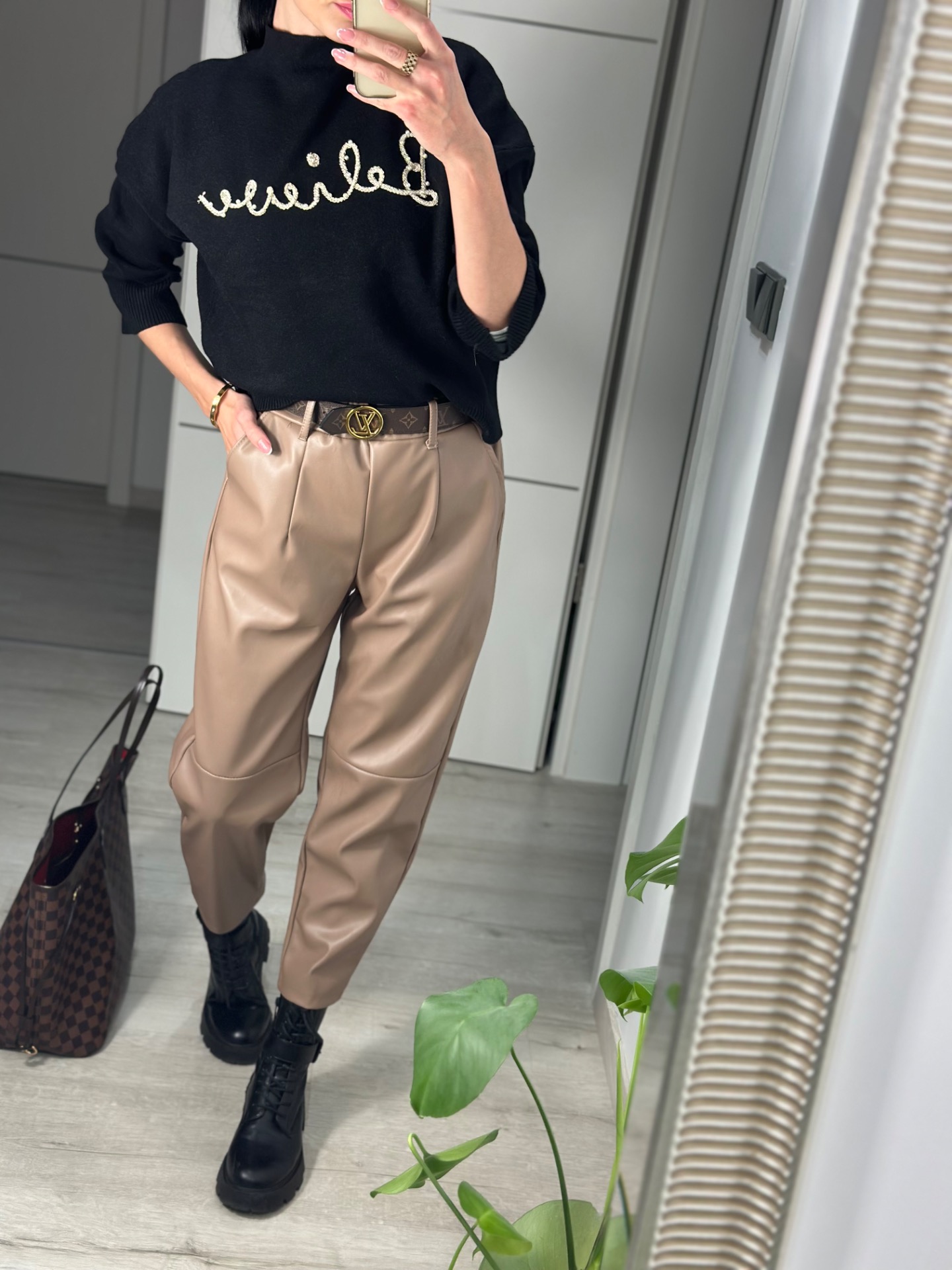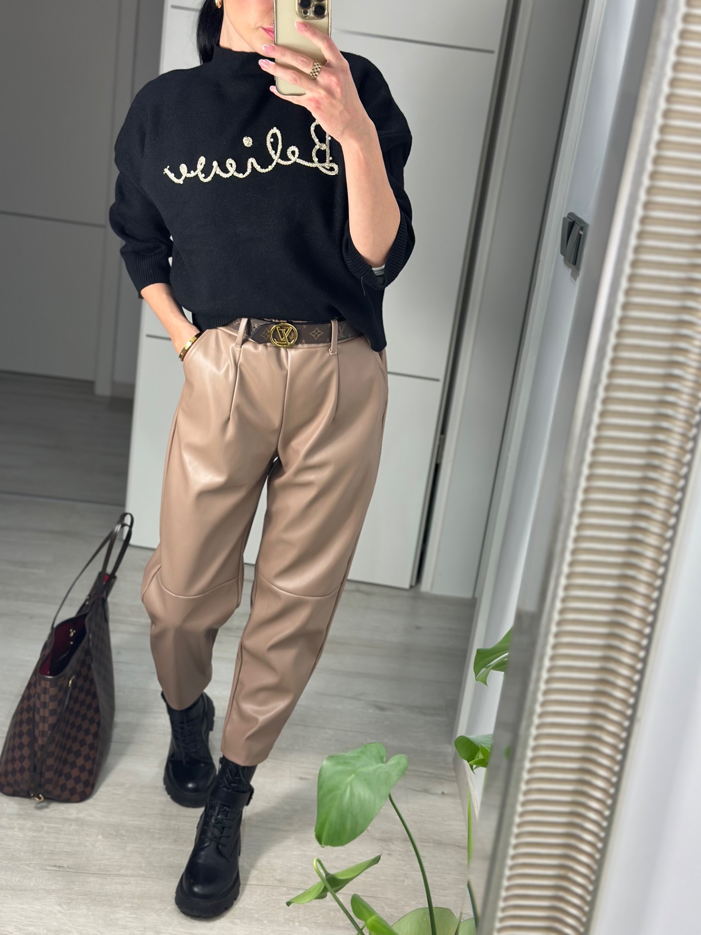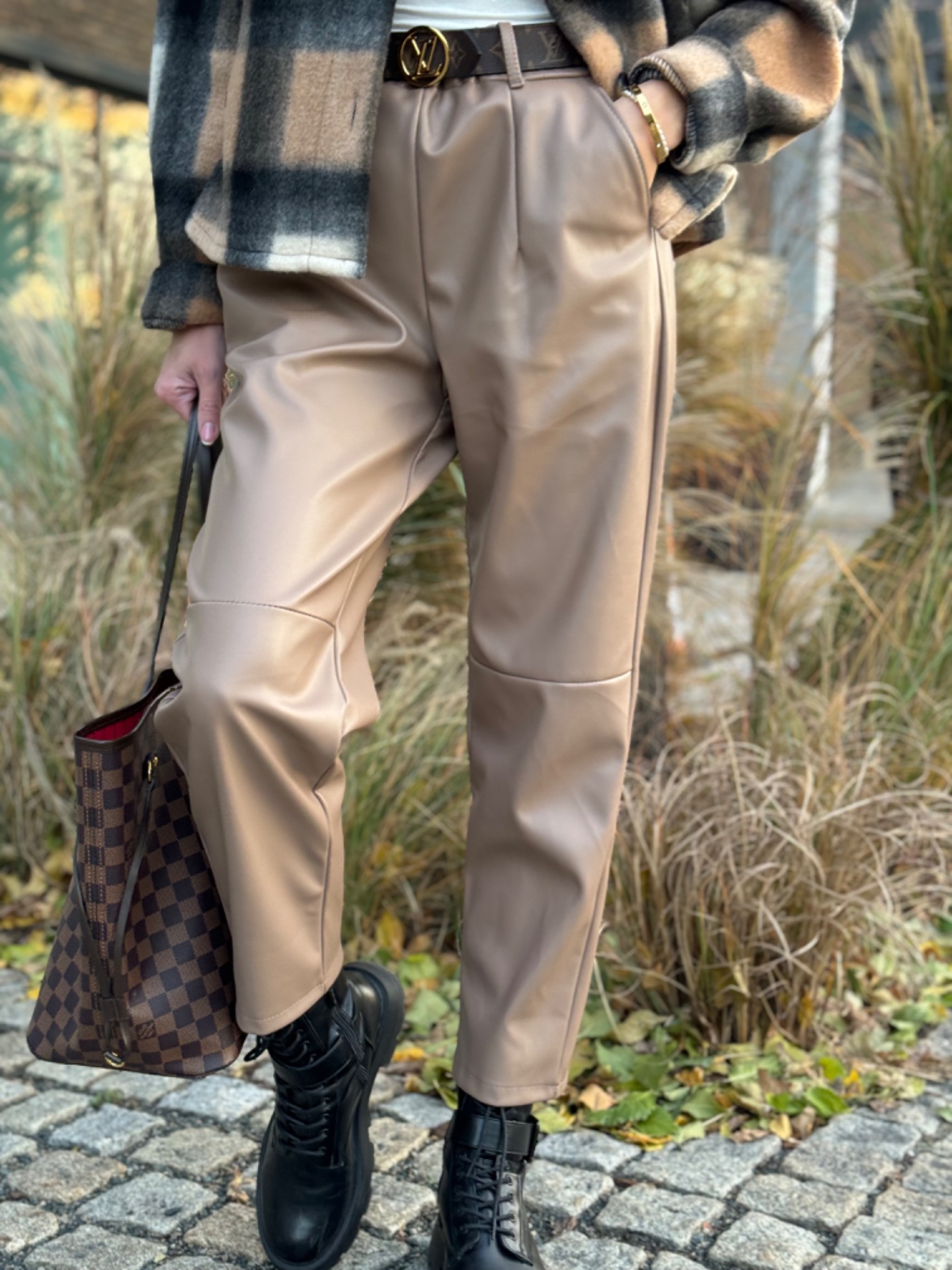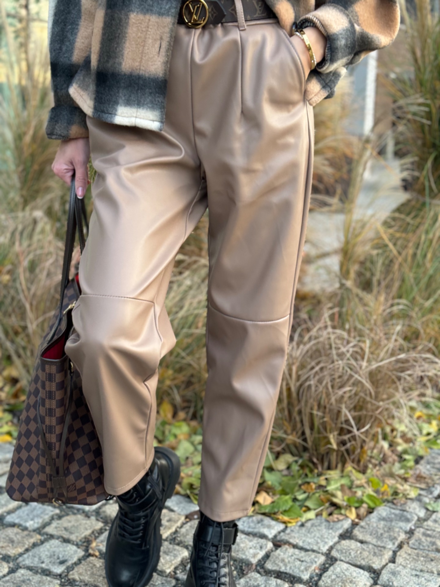 Koženkové kalhoty s moderními, širokými nohavicemi balónového střihu, které jsou nyní velký hit. Materiál nemačkavý. Skvěle "padnou" každé postavě. Kalhoty mají v pase gumu a pásek s poutky. Modelka má na sobě vel.XS na 172 cm vysoké postavě.