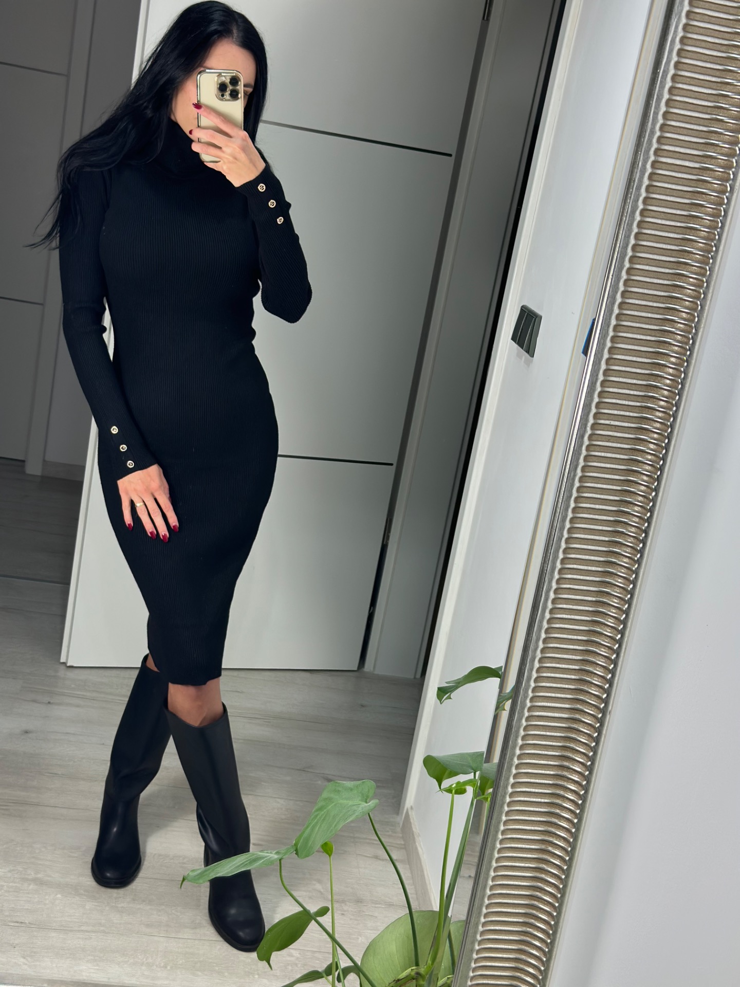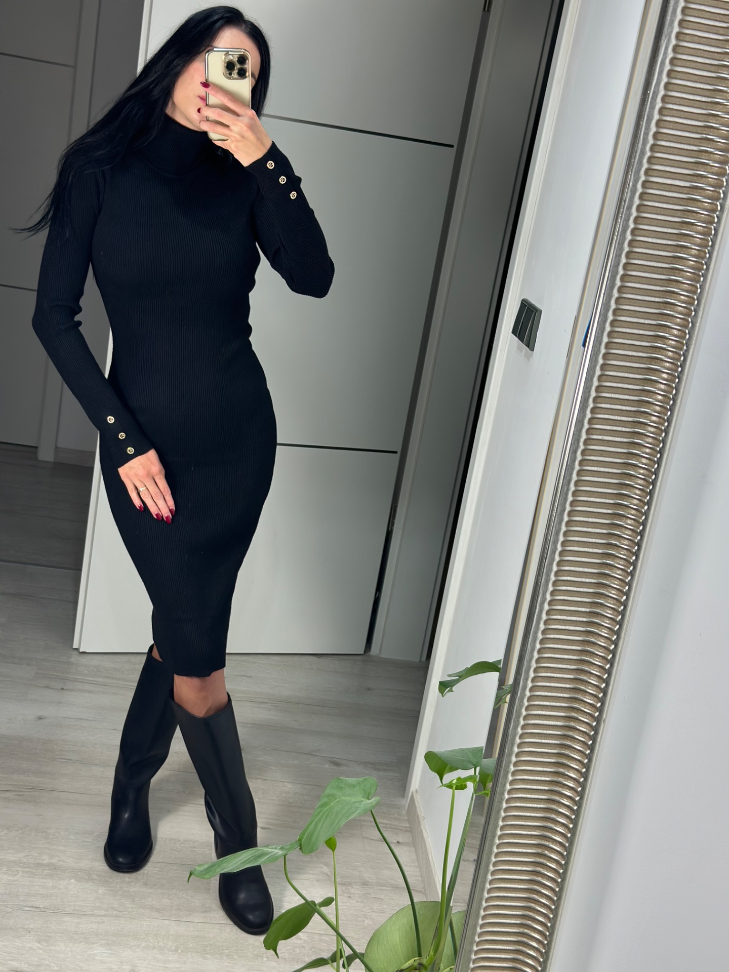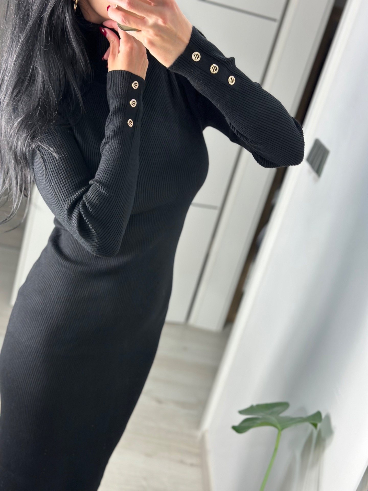 Elastické šaty z kvalitního, stahujícího úpletu. Šaty "dělají krásnou ženskou siluetu". Materiál "krásně drží" tvar. Šaty mají rolák u krku a žebrovaný úplet, decentní knoflíčky na rukávech. Extra pružný materiál.