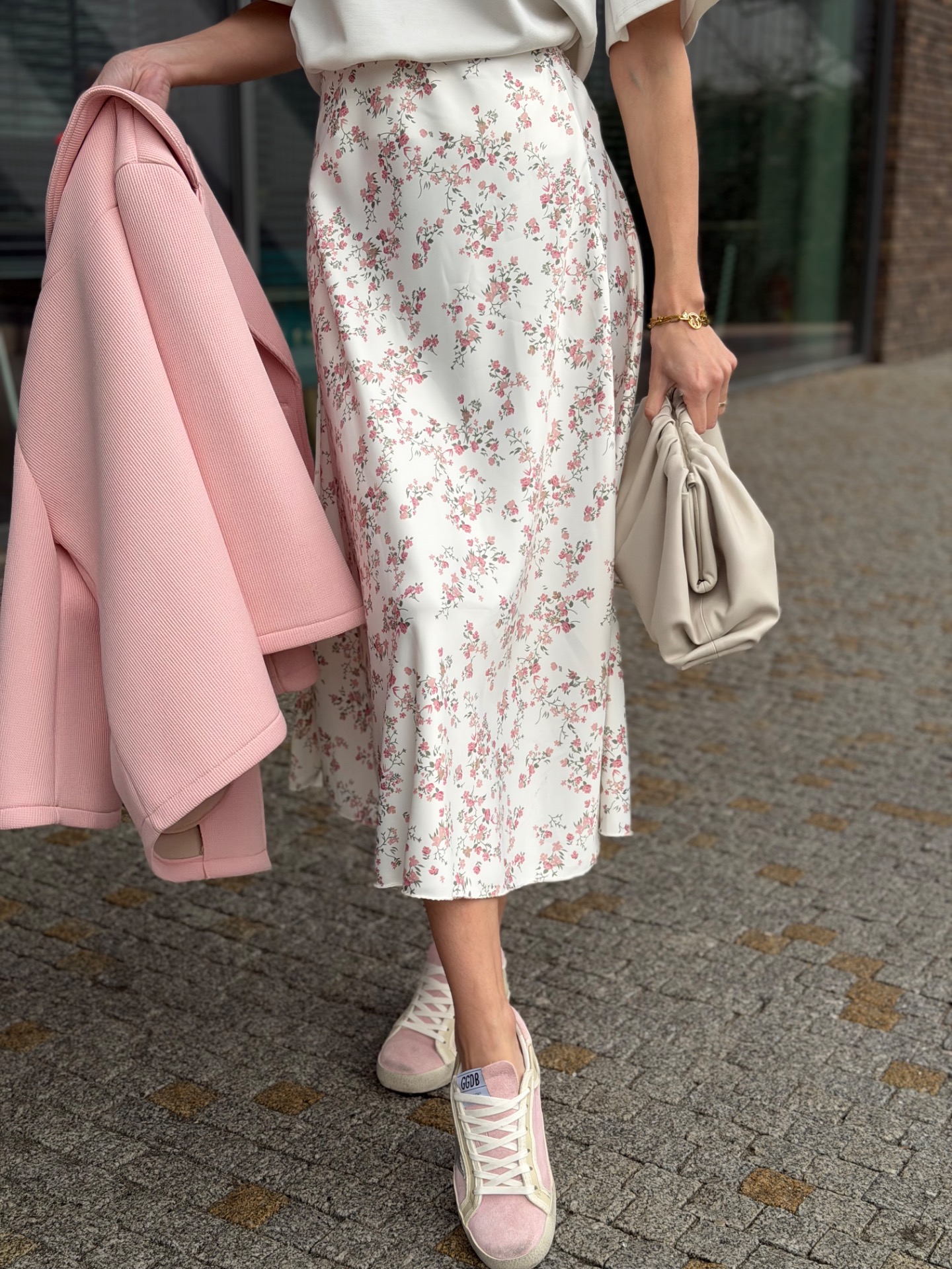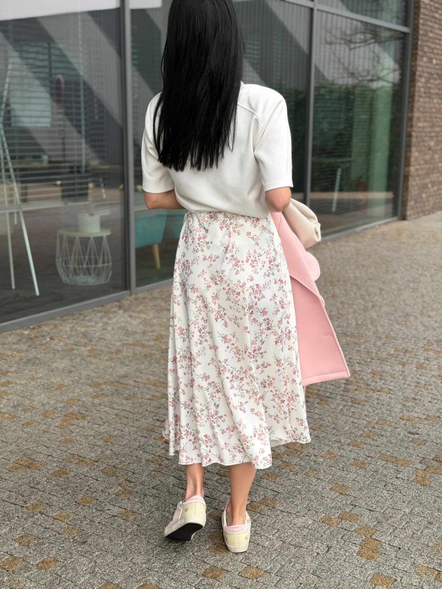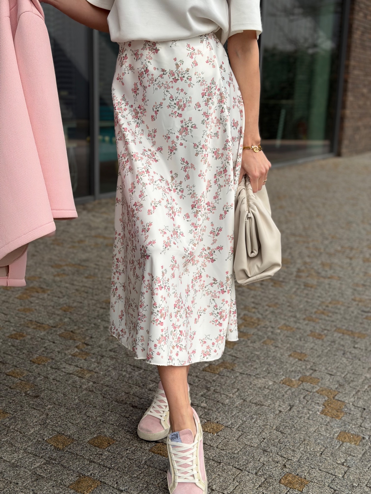 Sukně "saténového" vzhledu a v moderní "midi" délce. Sukně má v pase gumu a střih sukně je volný - "schová všechny nedostatky".
