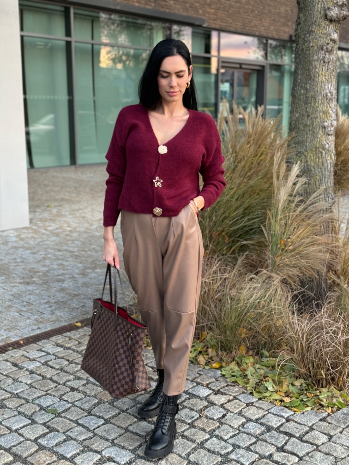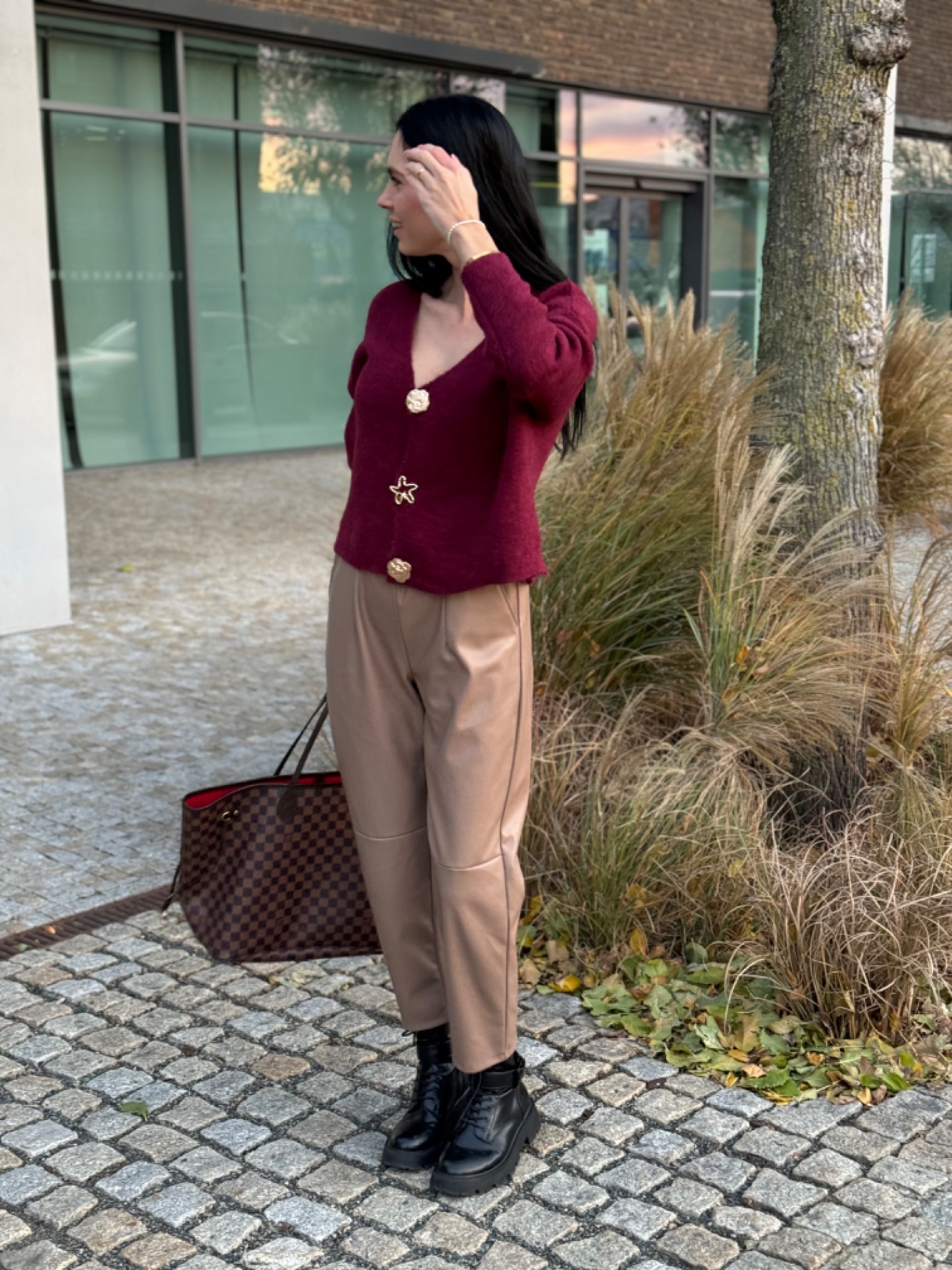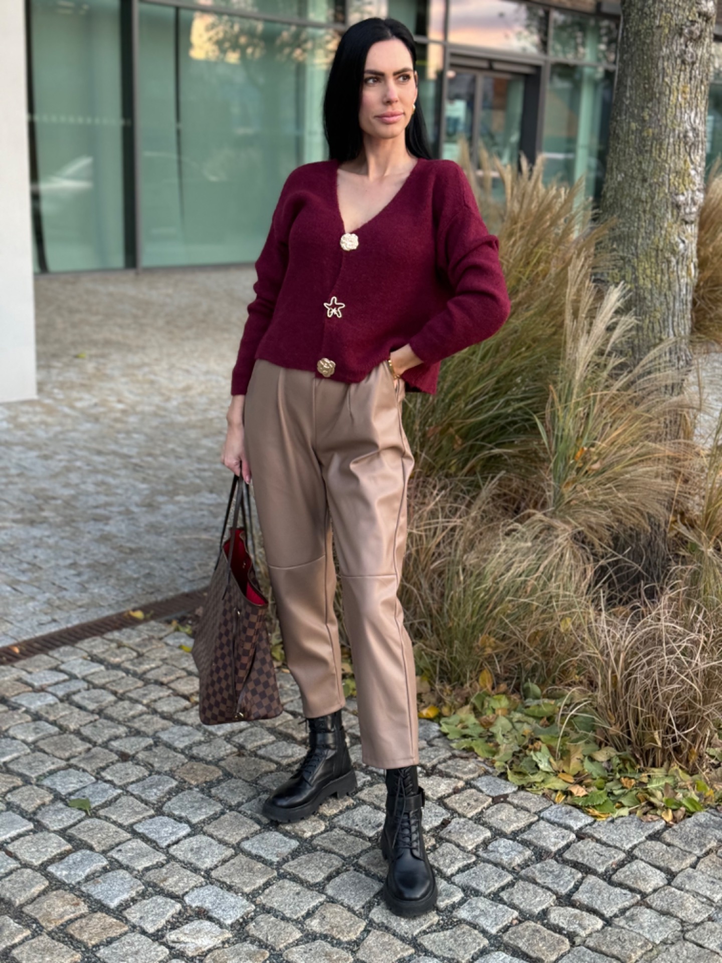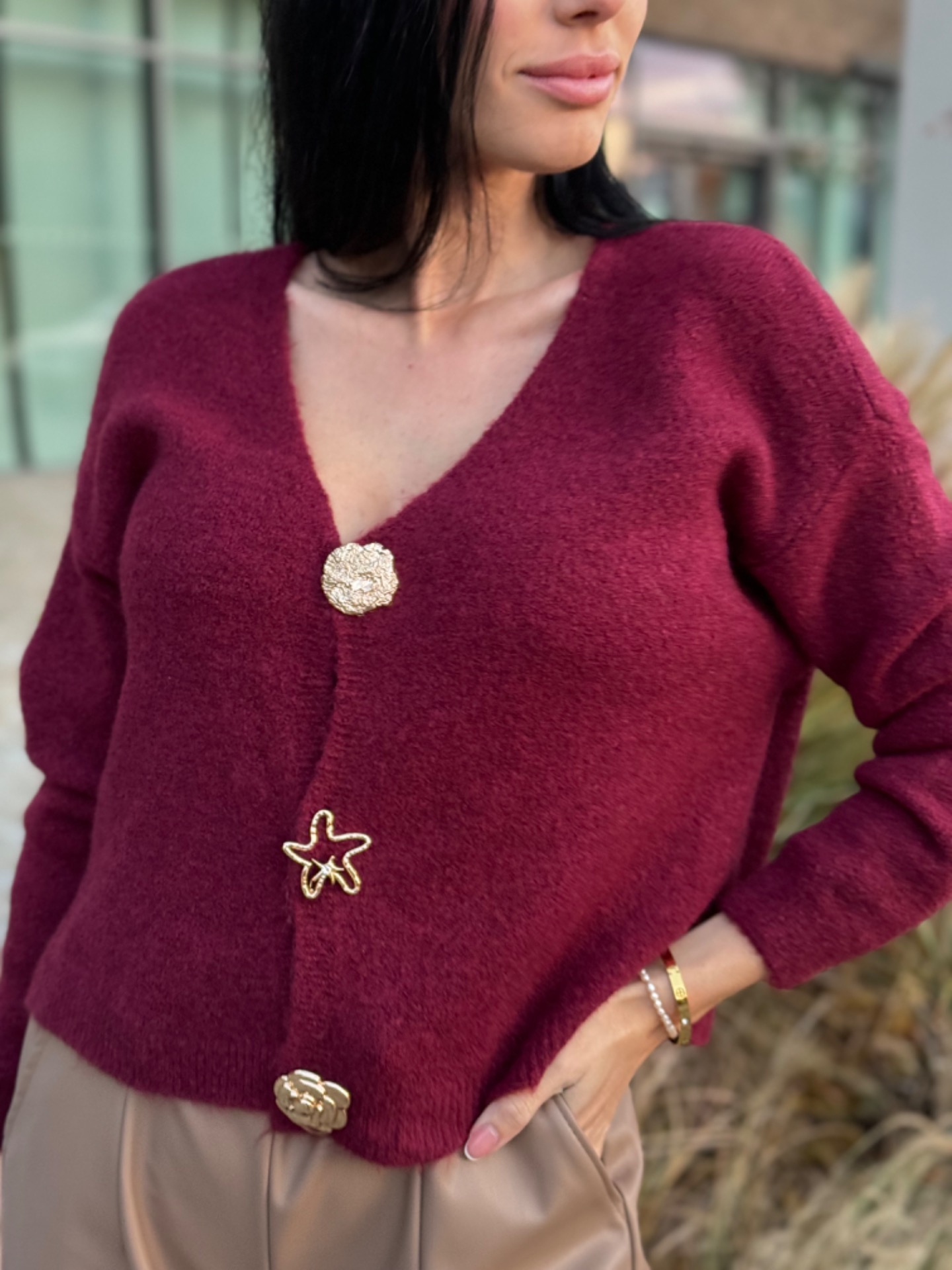 Úpletový svetr z příjemného a pružného materiálu. Zdobené knoflíčky a délka do pasu, skvělý k vysokým kalhotám.Foceno na postavě XS/172 cm. V nabídce ve více barvách.