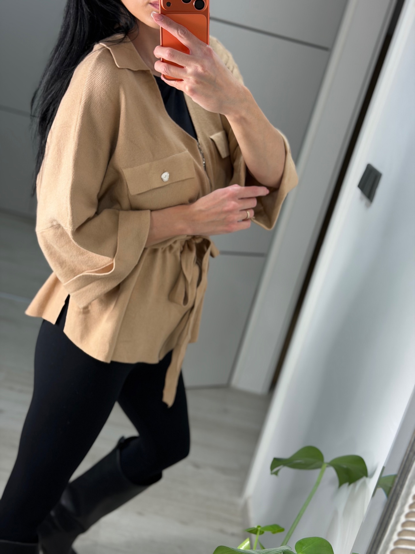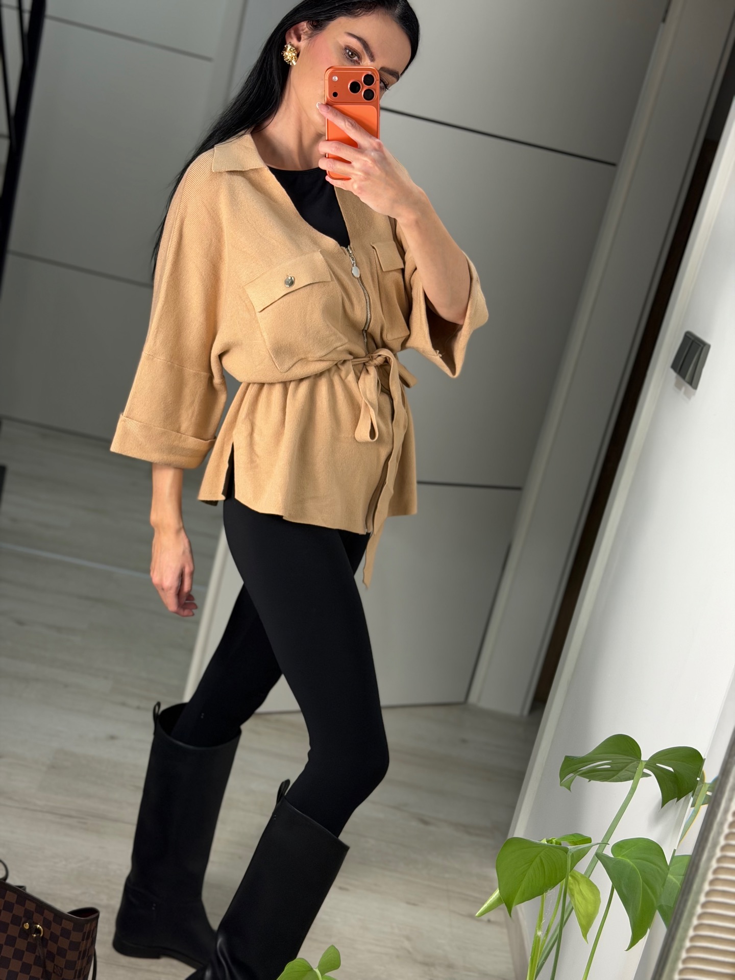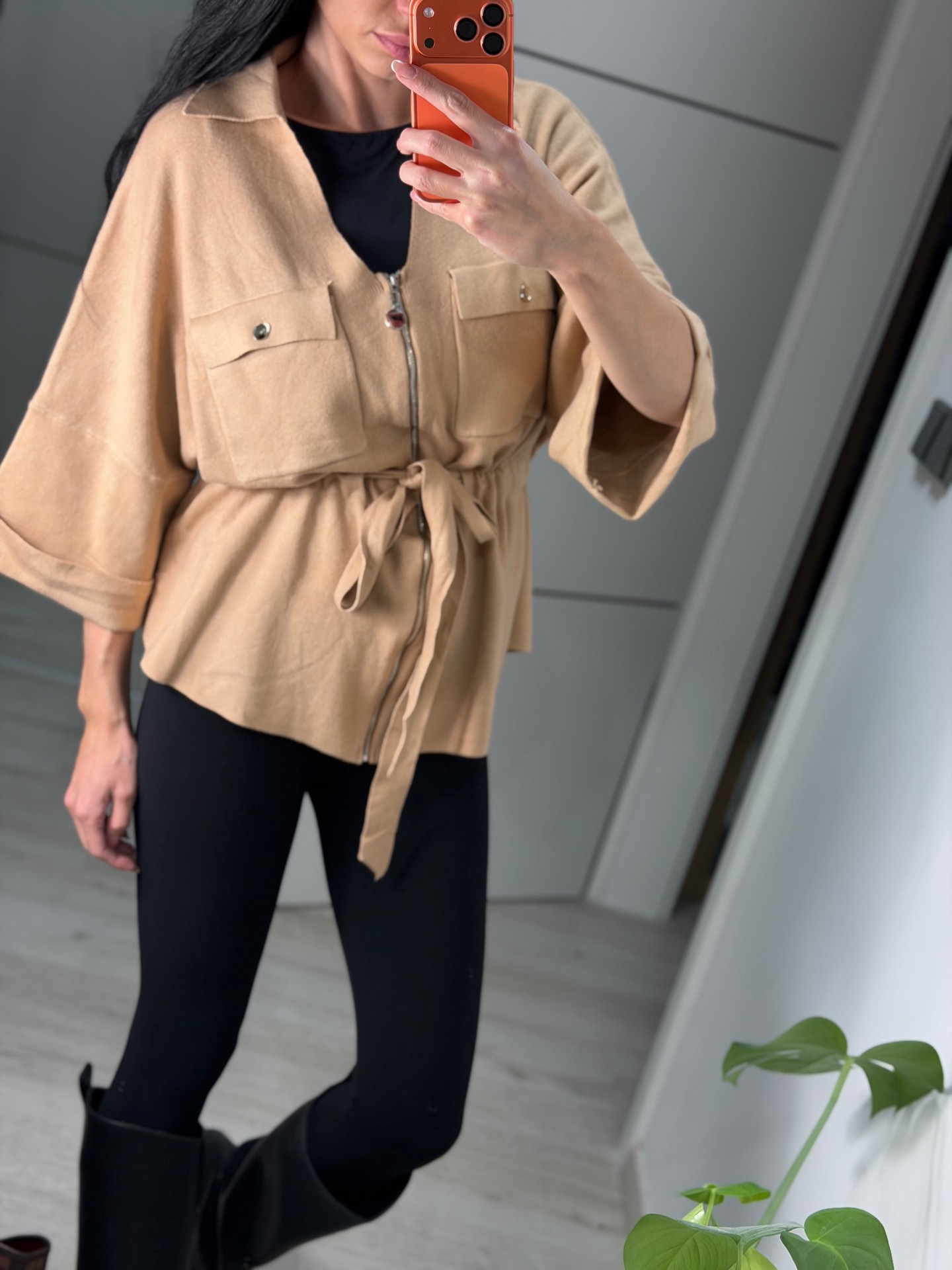 Úpletový svetr na stažení v pase. Foceno na postavě XS/172 cm. Zapínání na zip.