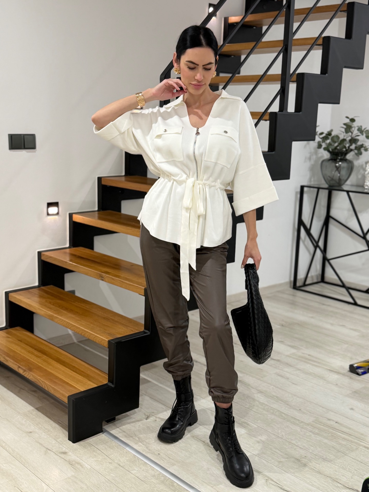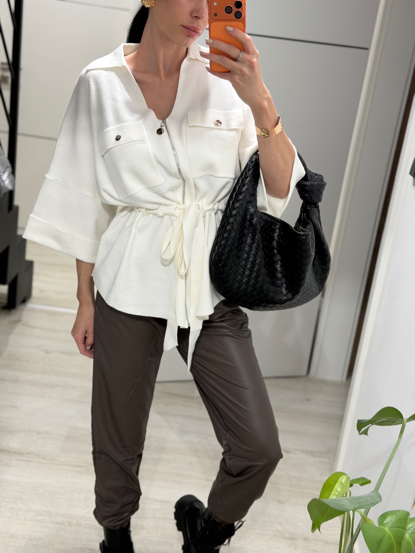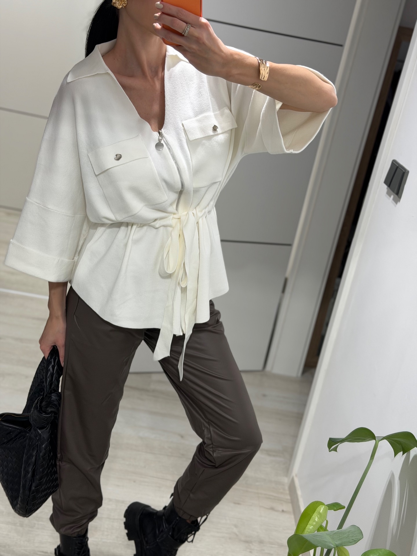 Úpletový svetr na stažení v pase. Foceno na postavě XS/172 cm. Zapínání na zip.