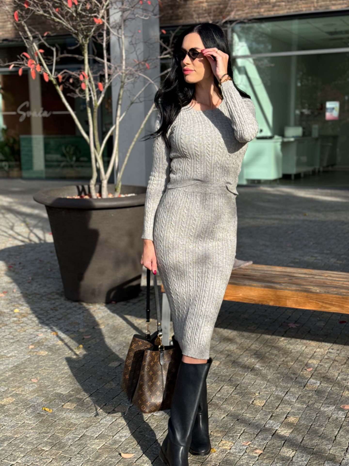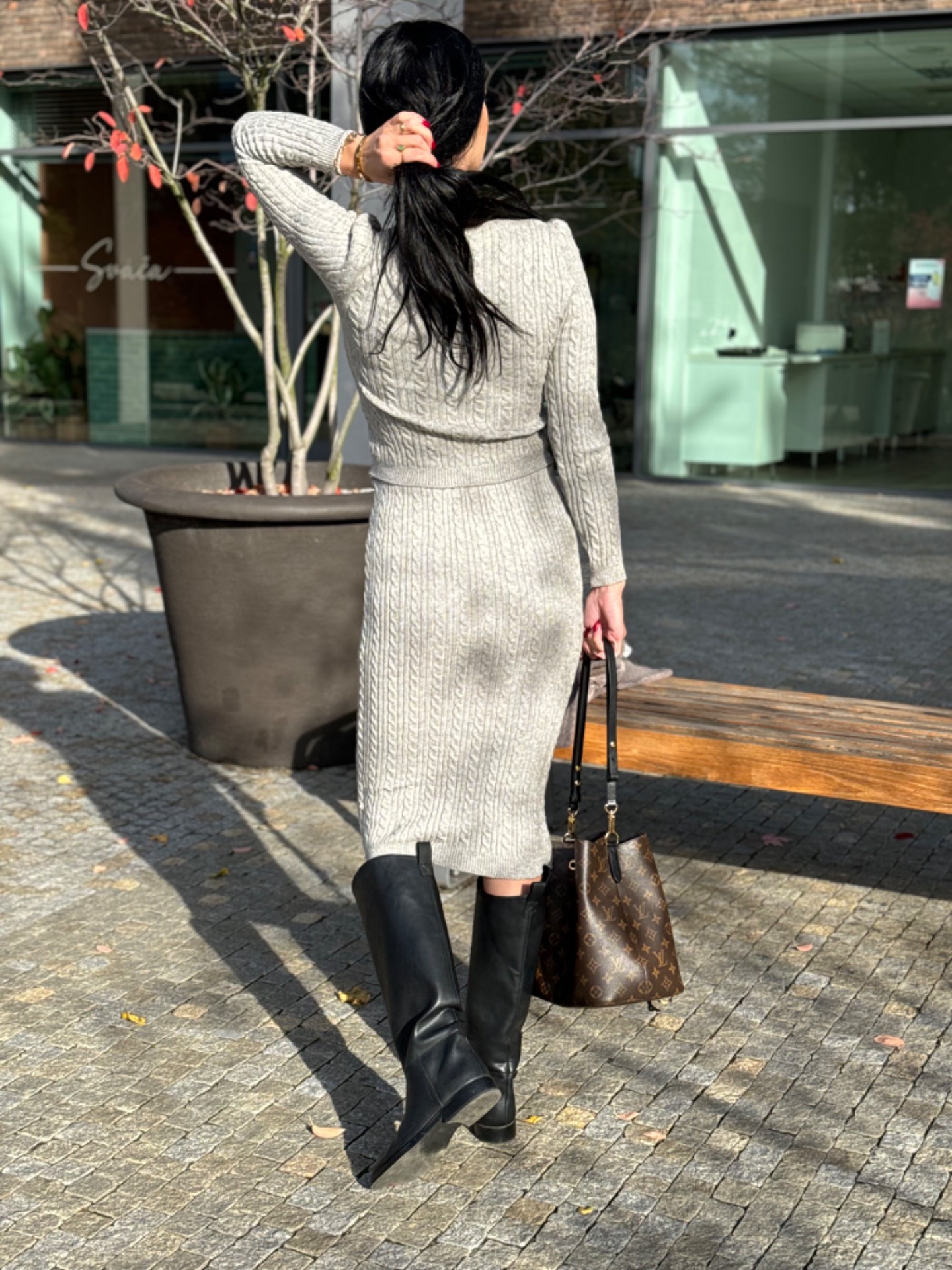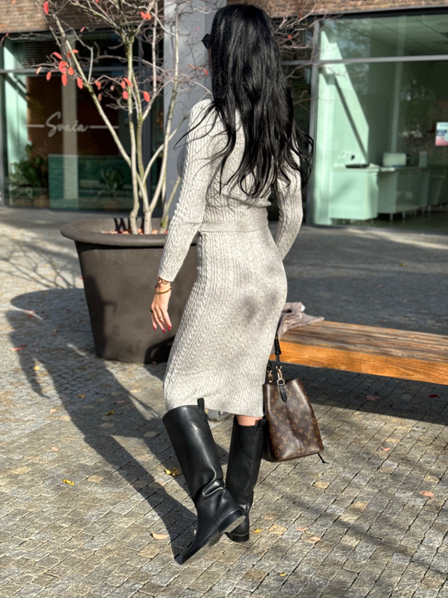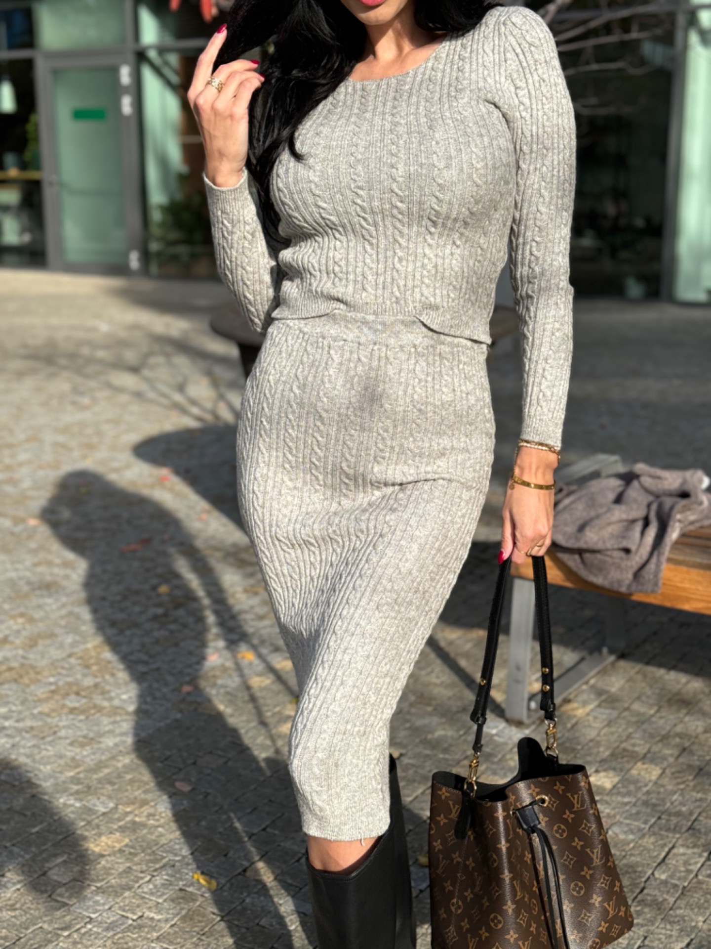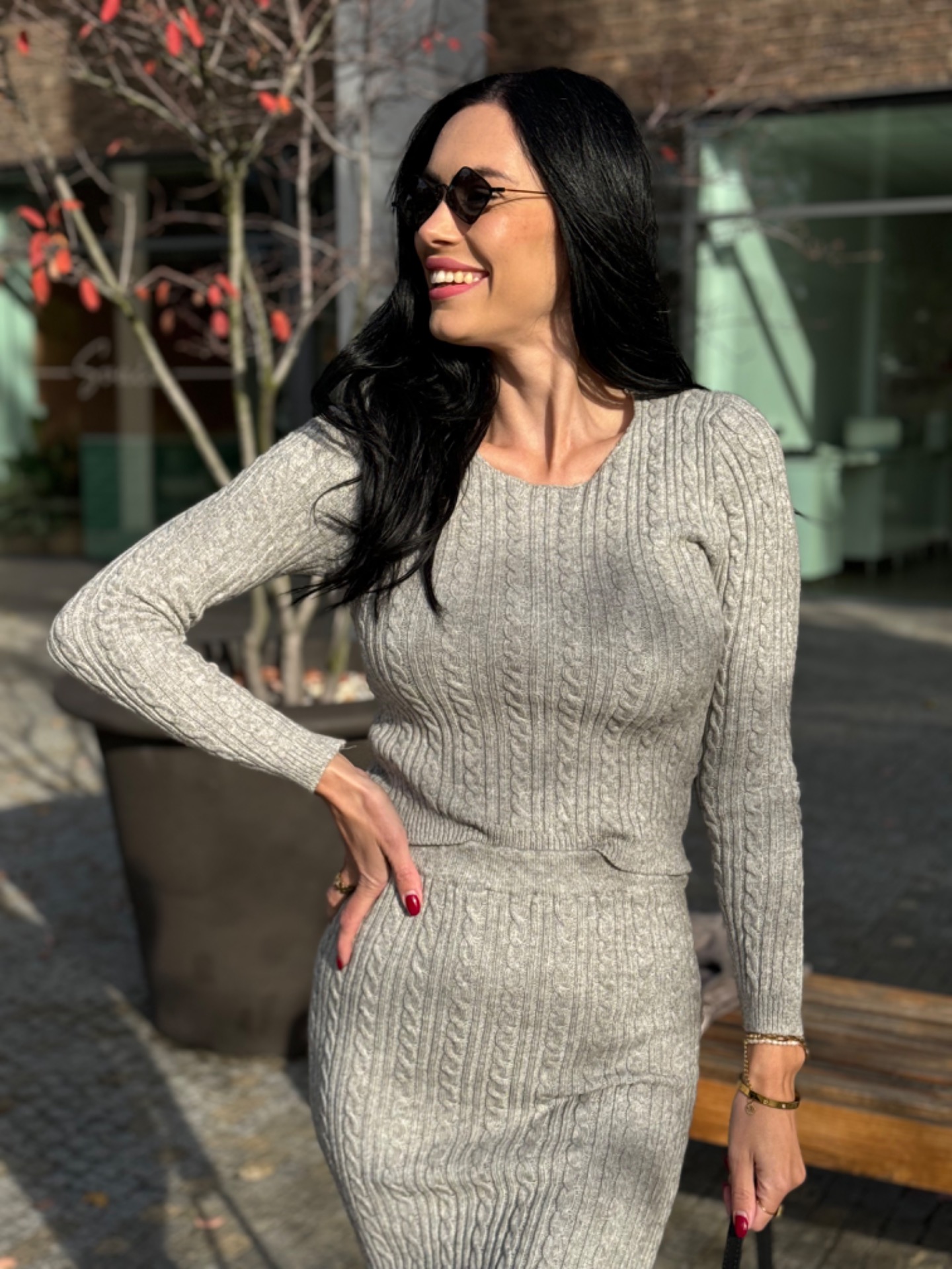 Nádherný komplet z úpletu - velmi kvalitní materiál. Copánkový vzor. Sukně v pase na širokou gumu. Foceno na postavě XS/172 cm.